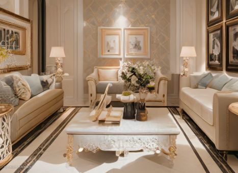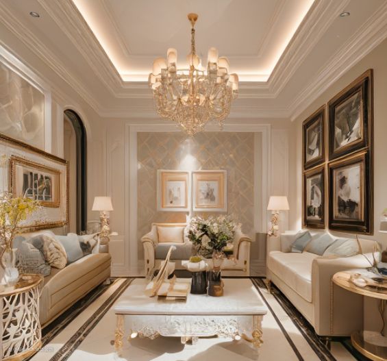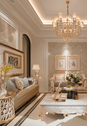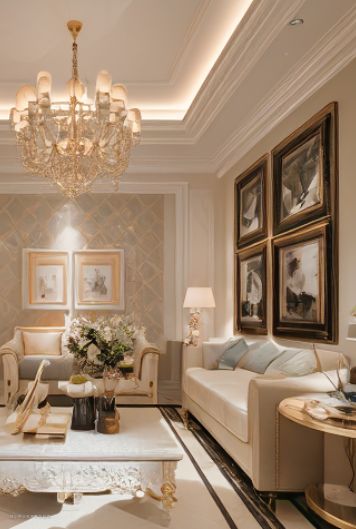 整屋采用奶油色系,这通常会为空间带来柔和、温暖和舒适的氛围。这种颜色选择非常适合与家人和朋友一起享受家庭时光。客厅回形吊顶搭配水晶灯能为客厅增添层次感和高级感。搭配闪亮的水晶灯,增加了空间的奢华感。采用U型沙发布局非常适合家庭聚会或与朋友一起观看电影。宽敞的U型沙发也能提供足够的空间进行休息和放松。方形设计感茶几简洁而现代,与U型沙发形成了良好的视觉对比。同时,由于它的方形设计,可以很好地适应沙发的布局。 墙面搭配复古艺术挂画为墙面增添了艺术气息,而复古风格则带来了独特的视觉效果。这种设计为空间增添了典雅和个性化的元素。