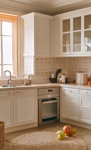 L型台面设计是厨房布局中的常见选择,因为它提供了足够的空间进行烹饪和备餐。这种设计也有利于提高工作效率。上做到顶橱柜设计非常实用,可以储存大量的厨房用具和餐具。同时,由于它一直延伸到天花板,因此也增加了储物空间。 选择米色系作为主色调,可以为厨房带来温暖、舒适的氛围。这种颜色也非常耐看,可以使空间看起来更大、更开阔。 浅咖色地毯搭配不仅可以增加舒适度,还可以减少噪音和防止滑倒。浅咖色的地毯与米色系的厨房形成了良好的对比,为空间增添了色彩和活力。将电器嵌入柜子中可以节省空间,并使厨房看起来更整洁。同时,这也便于日常使用和维护。
