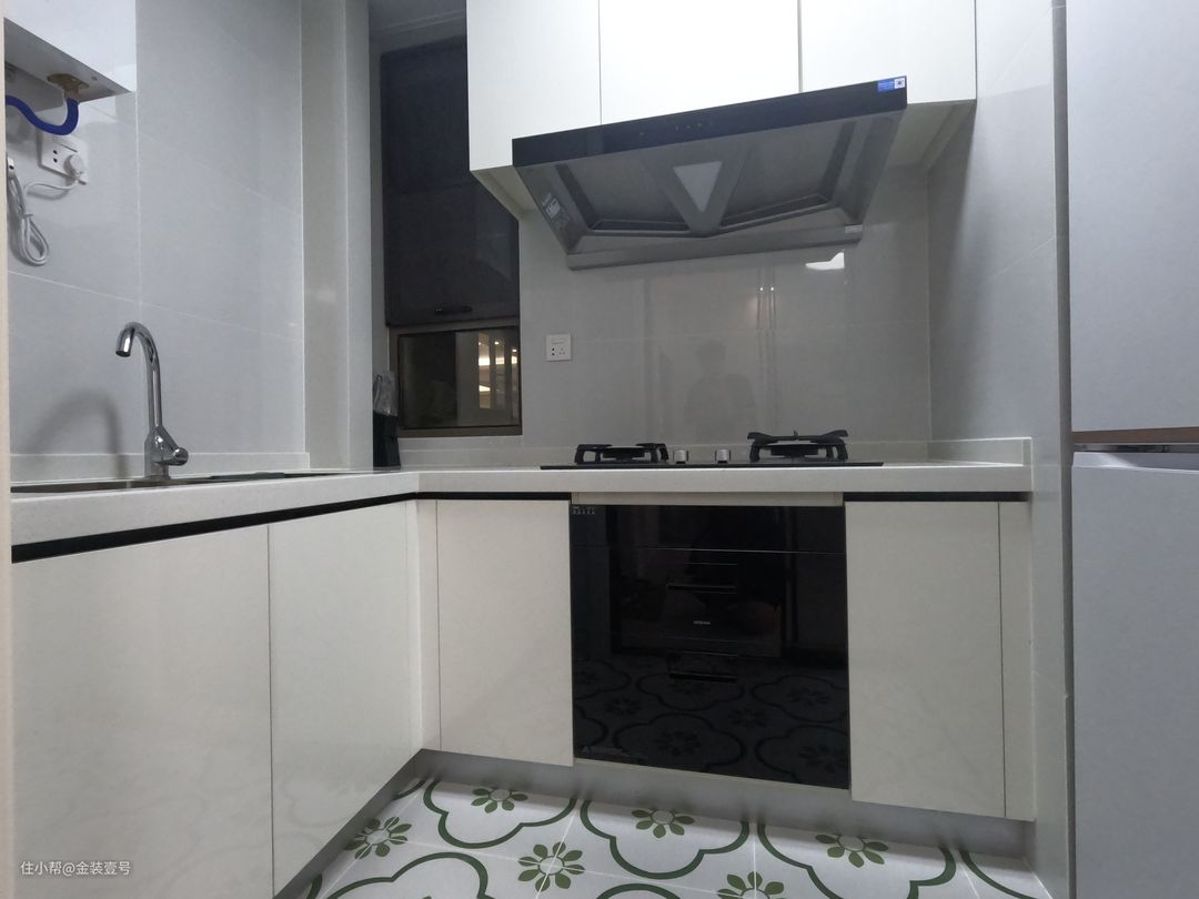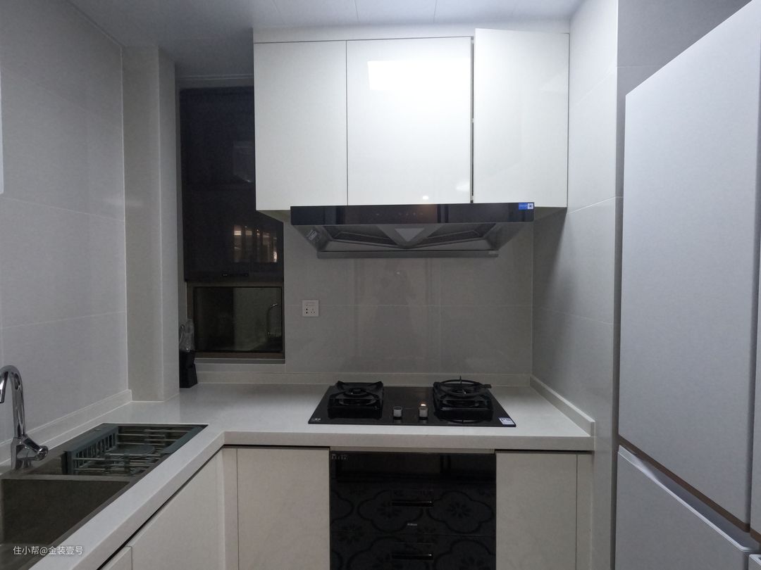 厨房门做无拉手设计,因为厨房本身比较小,台面和墙上几乎是没有多余的东西来挂或者放的,所以下方的定制柜拉篮,用来收纳各种厨房用品。