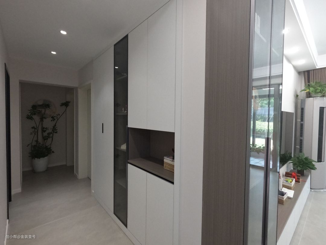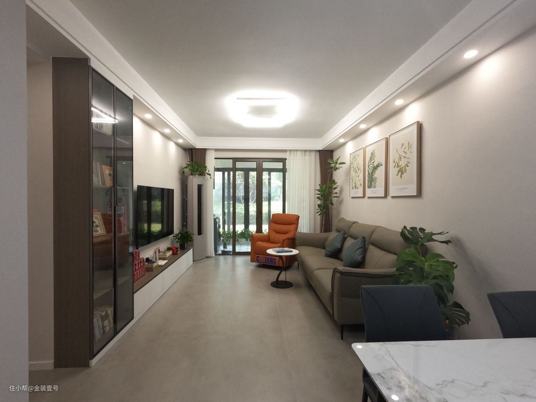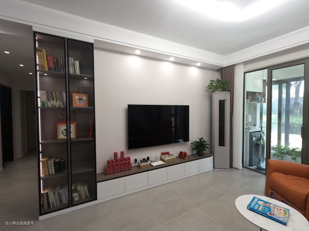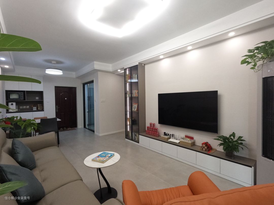 客厅整体还是以灰白为主,色彩的鲜明对比让空间的层次感增强。电视背景墙以白色打底,侧边做一组玻璃收纳柜,增强了整体的质感,视觉上看上去更加干净高级。