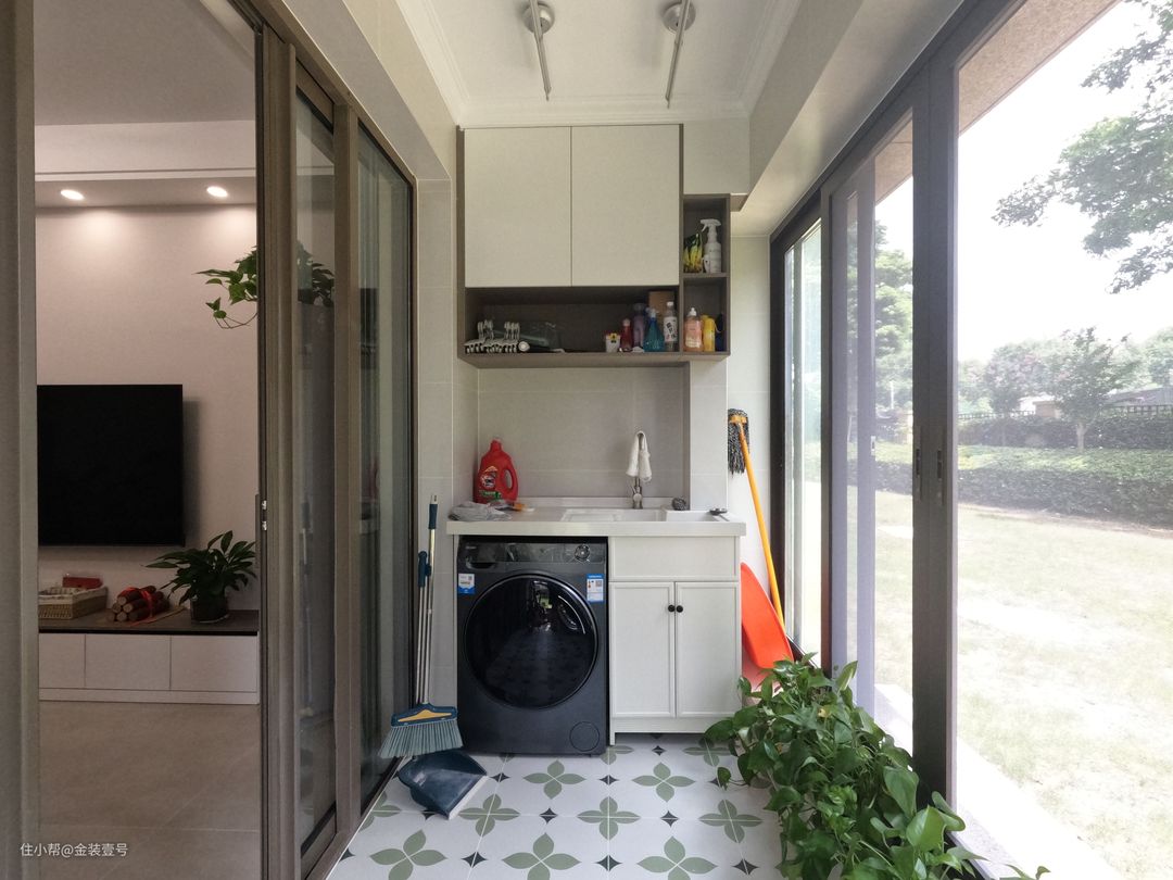 阳台做生活区使用,定制阳台柜,内嵌洗衣机。