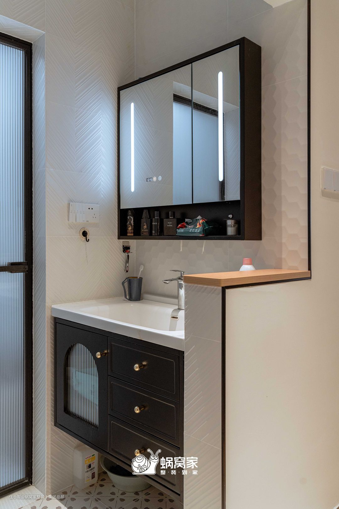 门洞做半墙设计,木条收口扩大干区台面空间,又削弱了瓷砖的生硬感,尽显美观又实用。