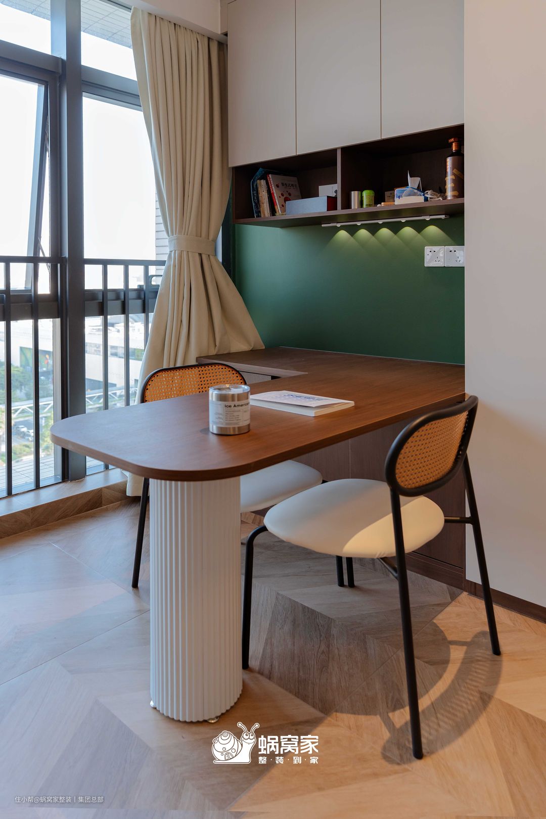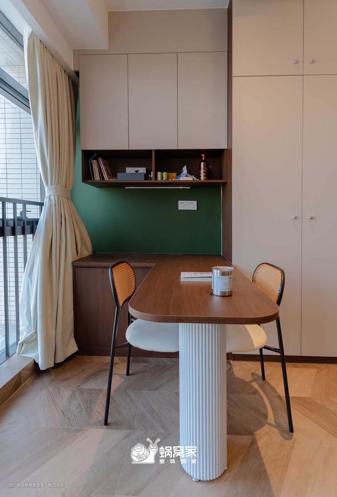 嵌入式的桌柜不仅减少台面杂物堆砌,还为办公学习、日常用餐提供充足空间。
