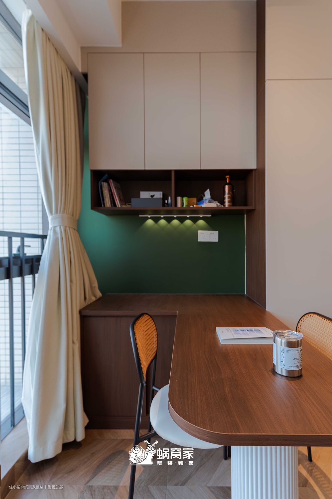 白柜与棕桌的配色,解锁不一样的视觉效果,而墨绿色墙面点缀,打破单一感,餐厅更有层次感。