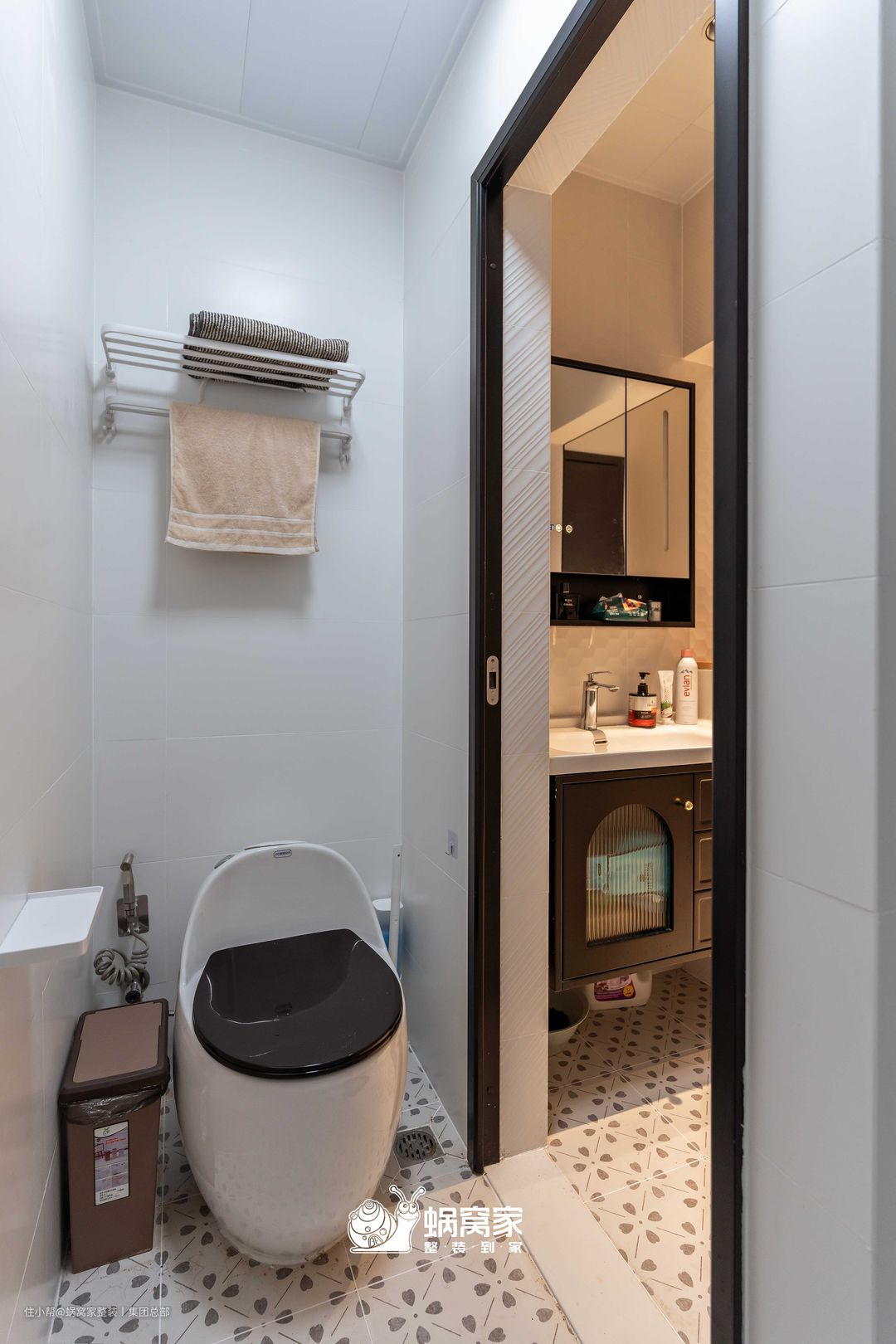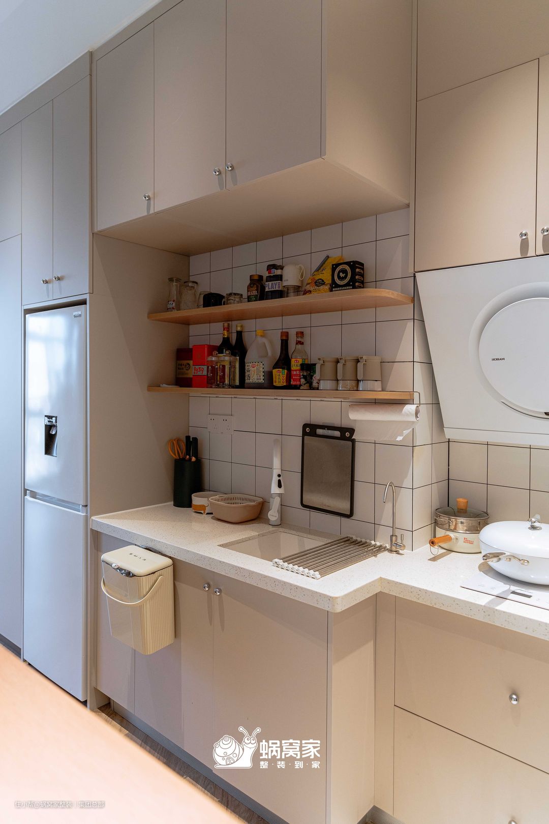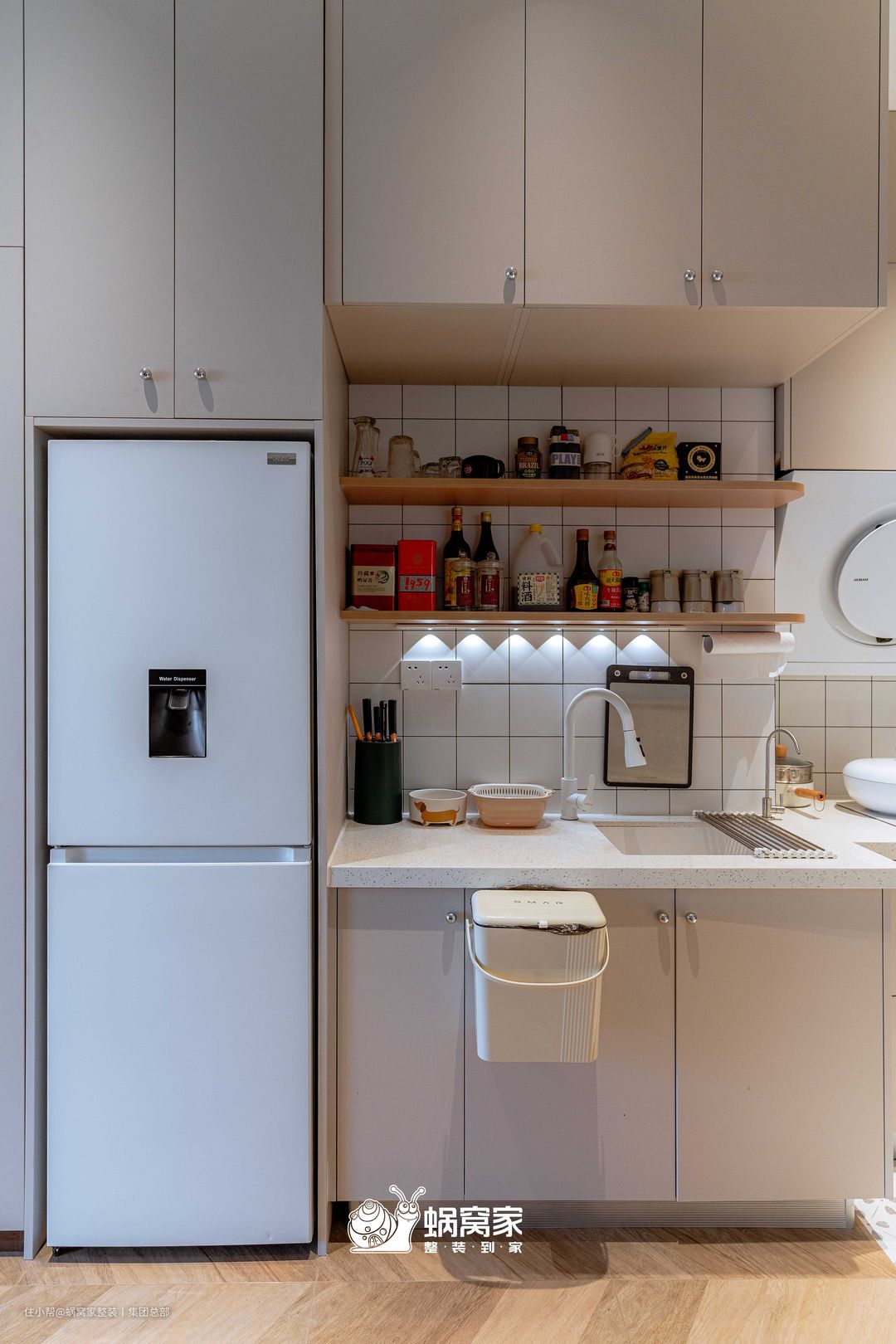 门洞做半墙设计,木条收口扩大干区台面空间,又削弱了瓷砖的生硬感,尽显美观又实用。