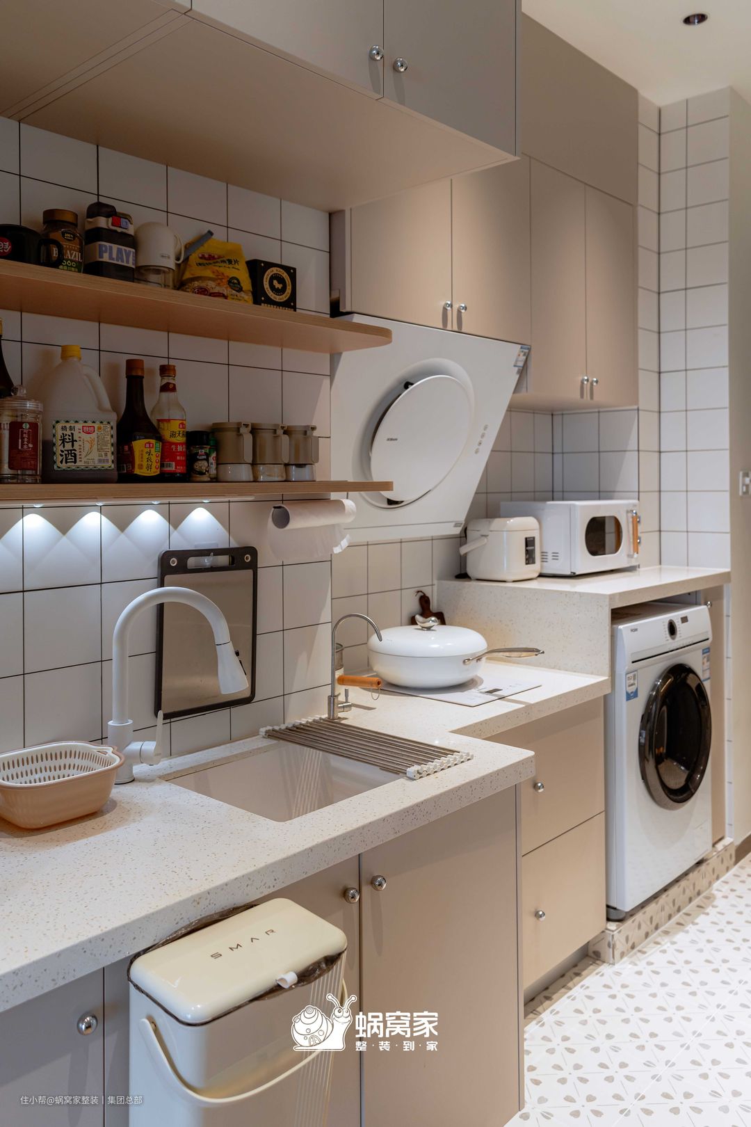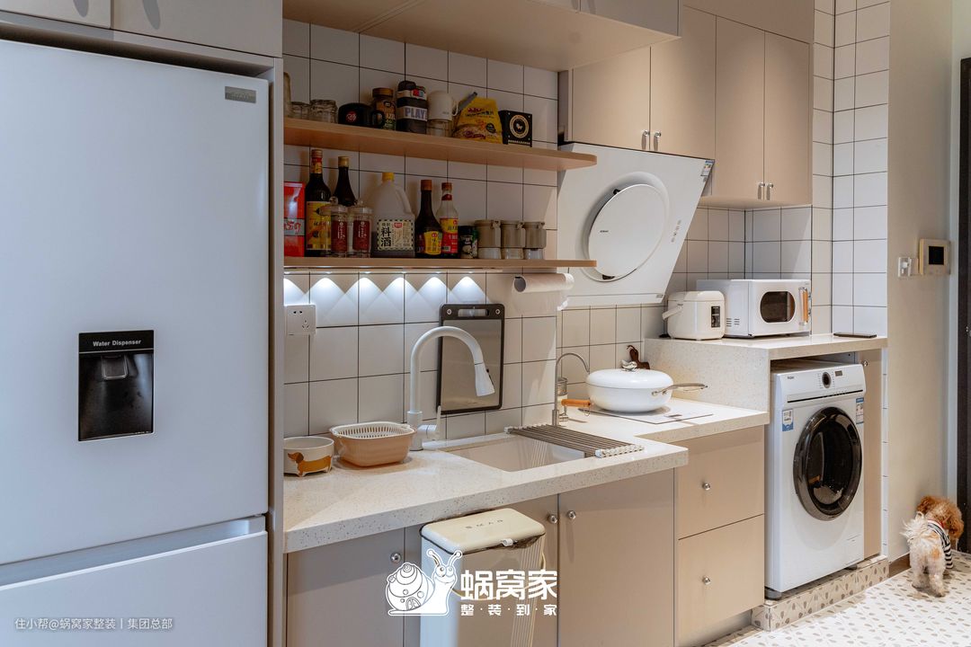 由于整体空间有限,开放式厨房能够最大限度的利用空间,由洗衣、收纳、烹饪依次分布,动线流畅。高低错落的设计也便于区域的划分,同时扩大了操作台的使用。 双层隔板同时满足备菜与收纳的功能,下方嵌入灯带筒灯,为备菜提供了辅助光源,灯效与辅助光源形成呼应,营造出敞亮通透的空间氛围。