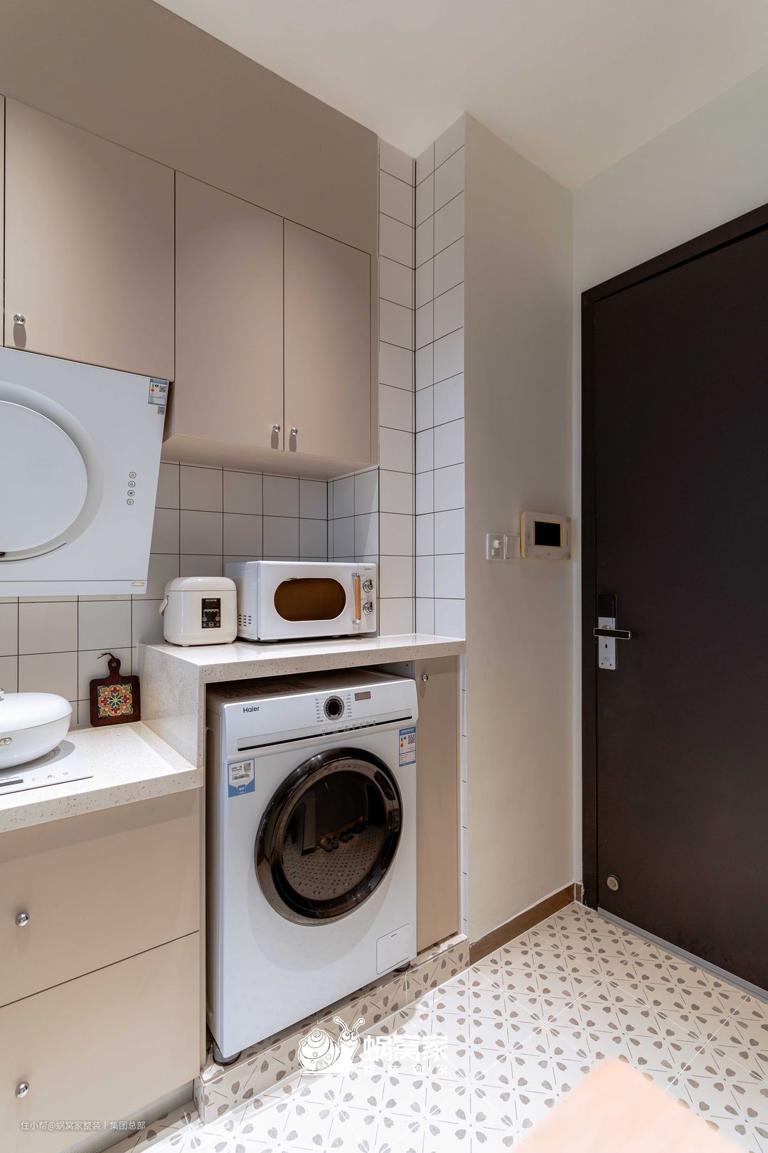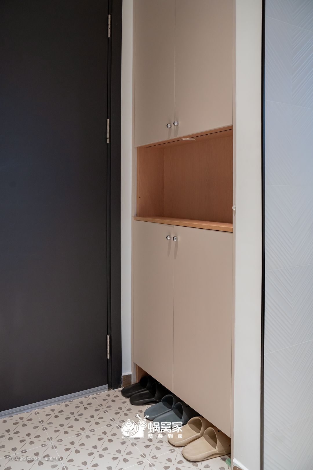 再小的房子也不能没有玄关,这是回家的仪式感。在玄关的处理上,选择直接嵌入墙体的定制鞋柜藏于门后,也便于进门和厨房区域的卫生打理。