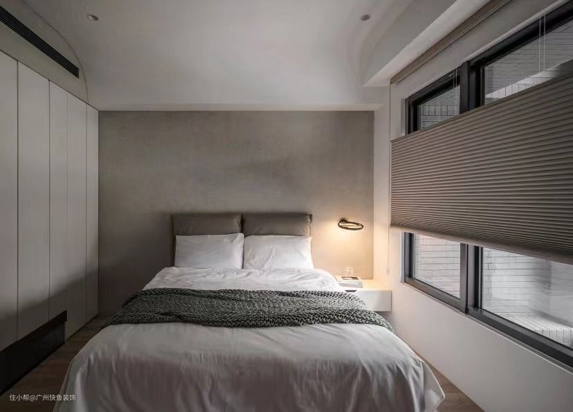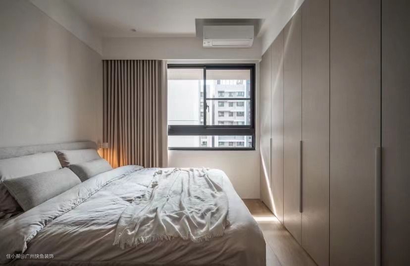 主卧延续主空间调性,素雅而温馨,床头背景采用留白的手法,不加多余的修饰和点缀,显得干净而利落,墙面的奶油色乳胶漆与定制的同色系衣柜相呼应 ,奶油色系的窗帘搭配浅灰白色的双人床更显舒适温馨