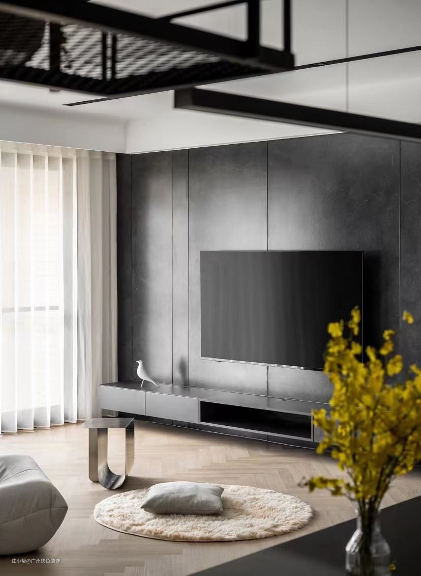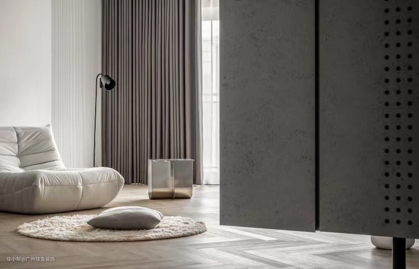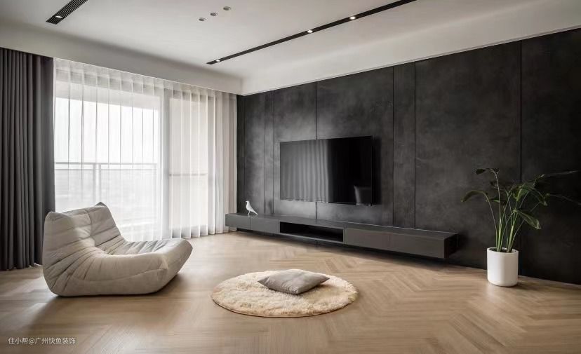 顺着玄关经过悬挂式立柜,便能看到客厅的一角了。客厅的布置在随意中又错落有致,地面通铺原木色鱼骨地板将整体的空间感下沉,加以无主灯设计使得客厅纵向拉伸,空间感跃然眼前,吊顶设计平整的线条流畅于房顶井井有条。