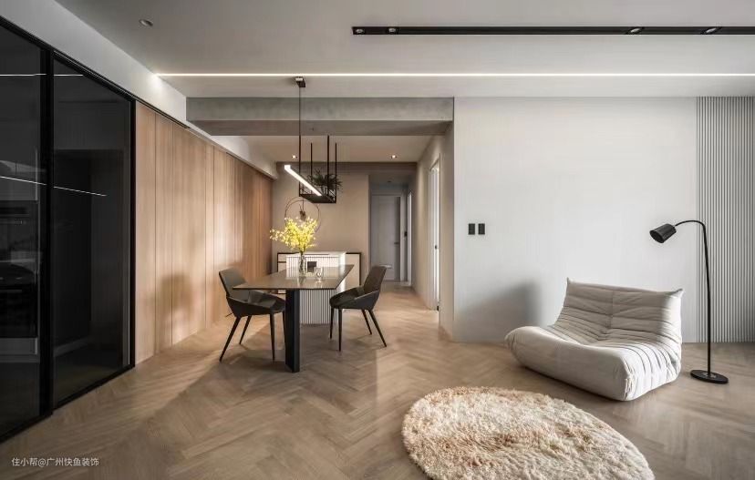 .在原始结构图的基础上进行设计,未有较大改动。 2.餐厅客厅“T字型”布局进一步将空间打开,客餐厅的空间连接避免用餐拥挤,视觉上能增宽客厅面积占比。