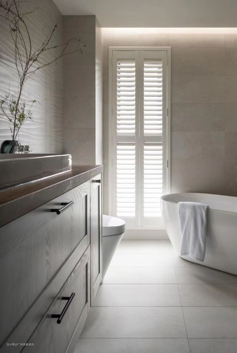 卫生间的瓷砖采用了原木哑光砖与波浪花纹哑光砖的拼接艺术调感,原木的洗手台与直条舒展的木枝条增添了浴室的观赏感,洗手台和马桶浴缸为房主带来绝佳的洗浴体验 ,格栅的纯白木门既能保障淋浴时的隐私又能使得卫生间更有呼吸感与通透感。
