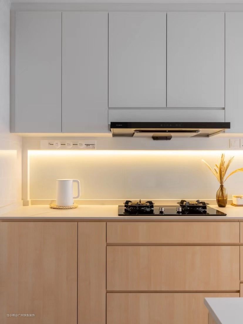 橱柜选择纯白与原木的拼接撞色设计,时尚而现代,温馨的线条灯照亮整个台面,分格的厨柜制造出巨大的分类储物空间满足一家人的基本生活需求,做饭也是充满幸福感。