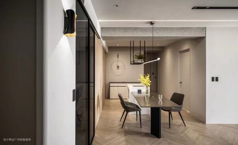 简约的直线餐灯平行于餐桌,餐桌选用稳固的铁艺支腿使得用餐位置变得更宽敞,黑色的磨砂餐桌方便油污的打理与擦拭,灯光与餐厅原木墙面的自然肌理交织,营造出温馨如日不落的用餐氛围,舒适的靠背椅使得家人能放松身心休憩交谈。