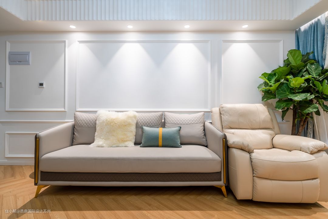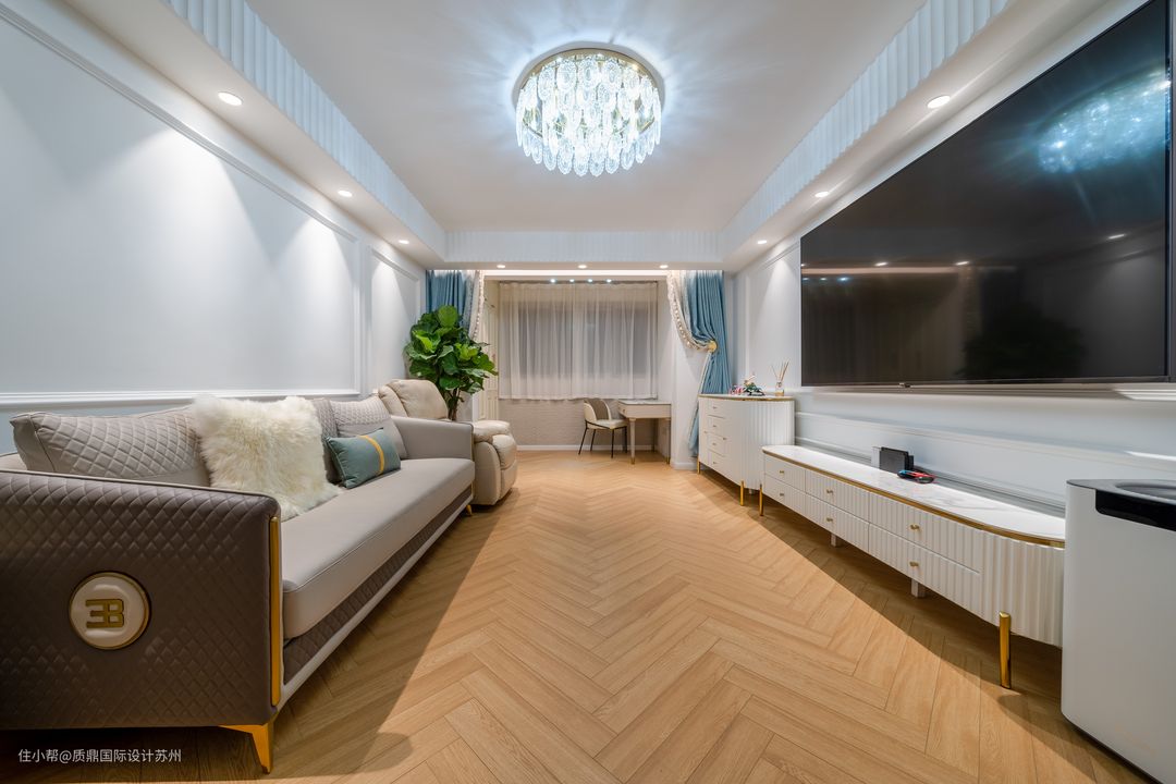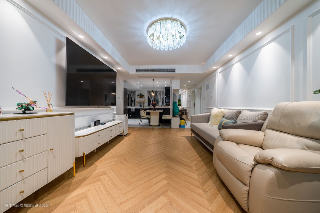 客厅以素白和原木为主,色彩搭配温馨、素雅,法式元素搭配将空间品质感表现得淋漓尽致。 背景墙典型的石膏线条设计,阳台垭口设计,窗帘搭配显现法式风。 主灯是一盏精美的吸顶灯,外加筒灯辅材照明。 吊顶只在四周及中央空调的地方做了处理,极简的天花板在视觉上有拉伸的效果。 电视背景墙与沙发对背景墙对称,没有多余的造型,整体格调统一。 法式的皮质沙发增加高级质感,在筒灯的照射下,整个空间更具时尚感。
