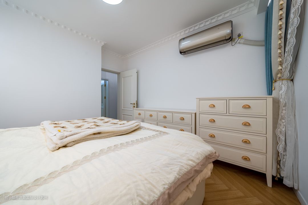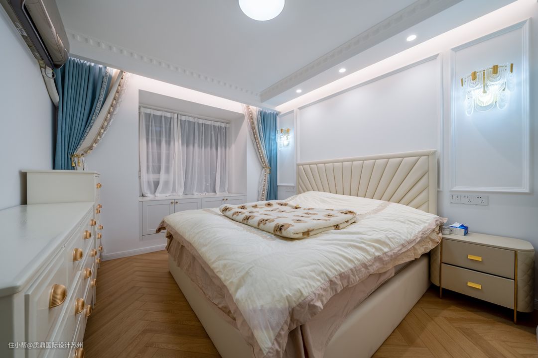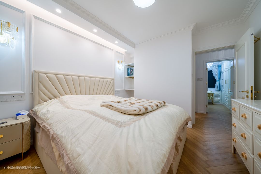 主卧造型优雅,辉映成趣的灯具,在淡雅的用色衬托下,格外浪漫,柔美,悠然自得的舒适与随意。 米白色的床和床品,看起来软糯,主卧看起来温馨,在夜间的视觉效果也很好,打造温馨的卧室氛围。
