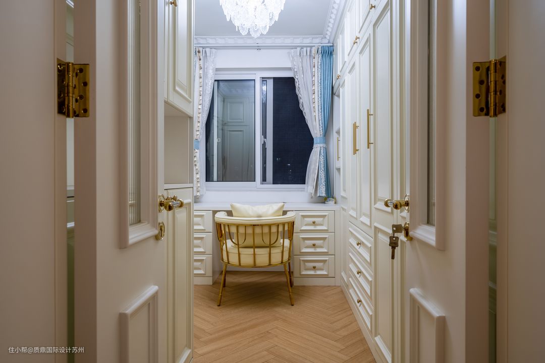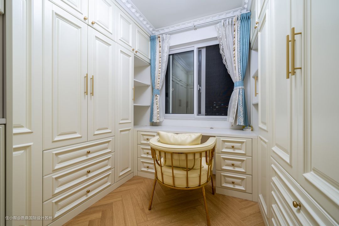家里小房间改造成衣帽间,法式的造型很优雅。 两排衣柜,收纳充足。窗下的梳妆台满足一切需求。