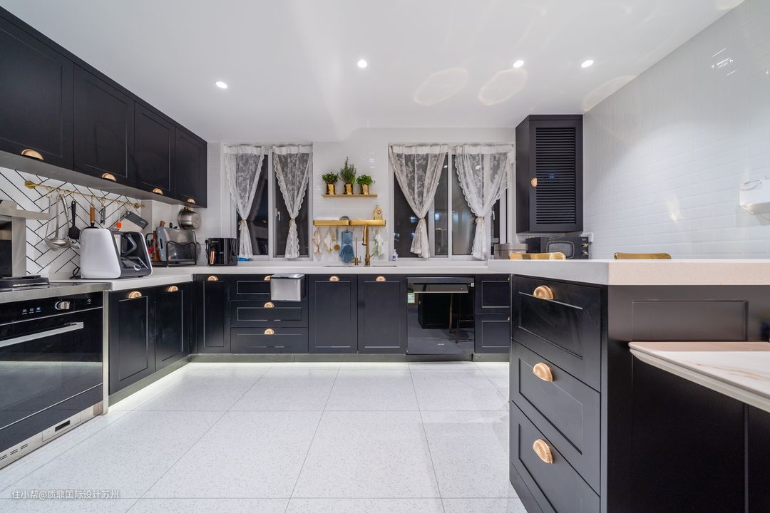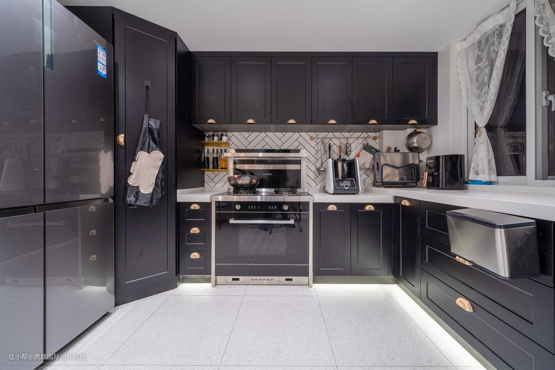 厨房开放式设计,比较宽敞,布局完整,功能齐全。 高柜增加了垂直收纳空间,旁边摆放双开门冰箱。 吧台设计既能划分区域,又能满足一家三口日常用餐的需求。