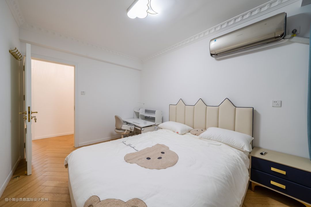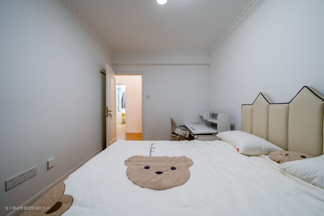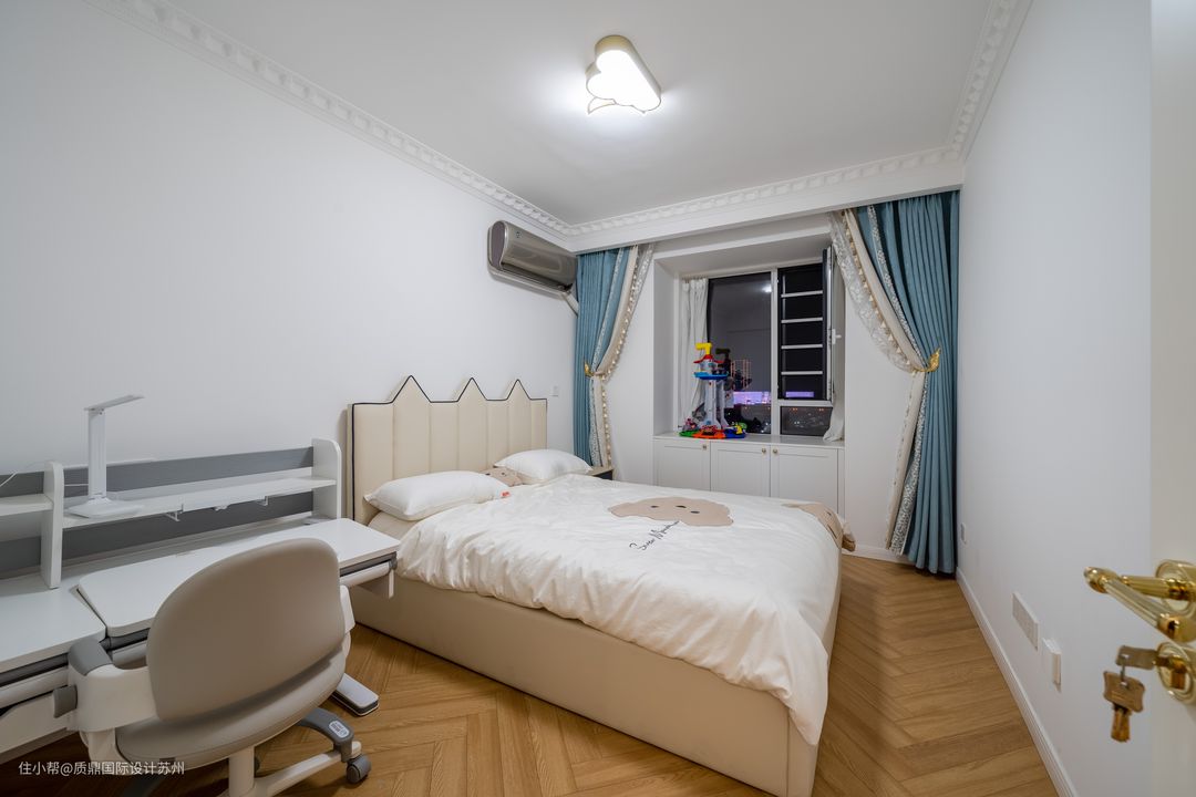 儿童房设计比较简洁,吊顶只做石膏线处理,干净利落。 床与床品的搭配比较可爱,床头一侧是床头柜,另一边则是学习桌,方便小孩学习使。 窗台下面打造柜子,增加收纳。窗台也是小朋友玩乐的区域,摆放着小孩喜爱的玩具。