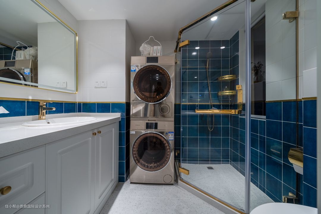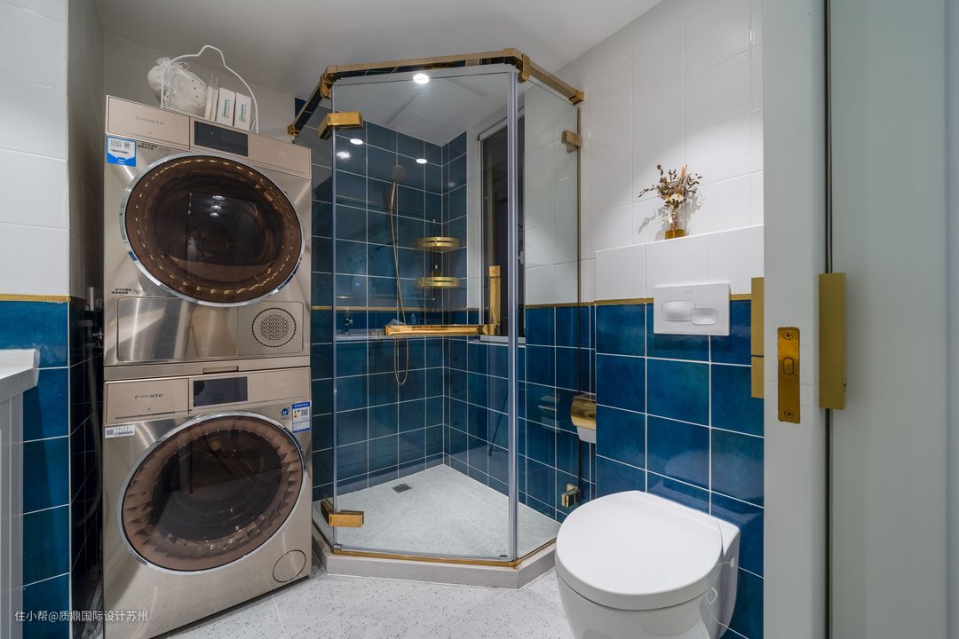 卫生间以蓝色作背景处理,淋浴房金色边框点缀。马桶隐藏式水箱,节省空间。 淋浴房与墙面凹槽的地方刚放摆放洗衣机和烘干机,合理的规划,将空间利用发挥到极致。