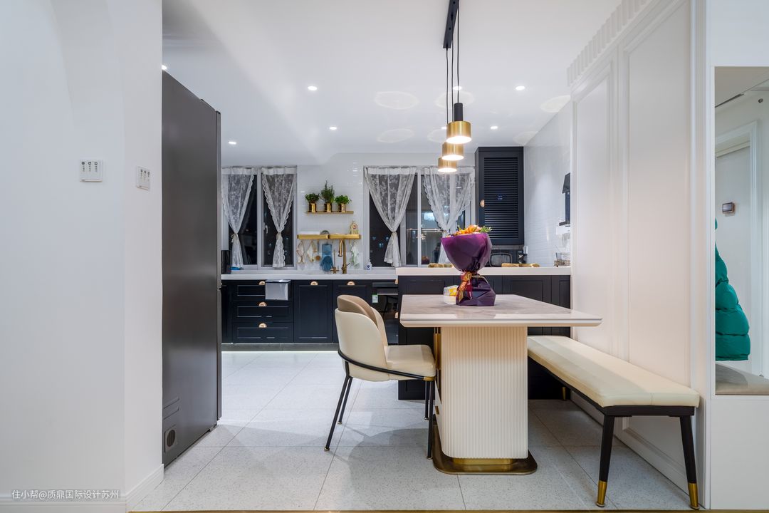 餐厅设计在吧台旁边,与厨房融合。白色灯光进一步提亮光线,增强空间感。 卡座的处理更节省空间,不影响使用时的正常动线。 吧台连接餐桌,延伸使用。使用金属边的吊灯照明,营造用餐的舒适氛围。 自然光线透过厨房引入客厅,同进增加餐厨区域的通风性。 置身于这一空间,会感受到流动的明快、清透,不自觉地放慢用餐节奏,在忙碌一天后重新认识自己的情绪。
