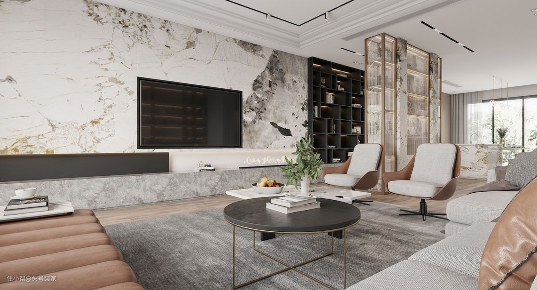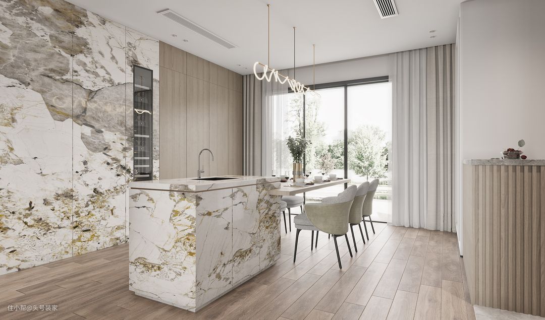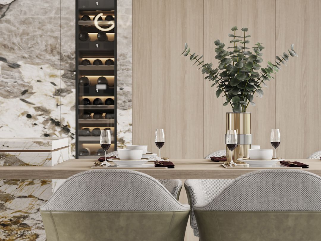 餐厅追求舒适、优雅与品质。长木桌与周围椅子的搭配,营造出宽敞而温馨的氛围。白色和灰色的桌布,不仅突显出简洁明快的特点,还展示了高雅的品位。中央的绿色椅子则是点睛之笔,为整个空间增添了一抹独特的色彩。大理石瓷砖的墙壁和木墙的背景,彰显出质朴与自然的和谐。