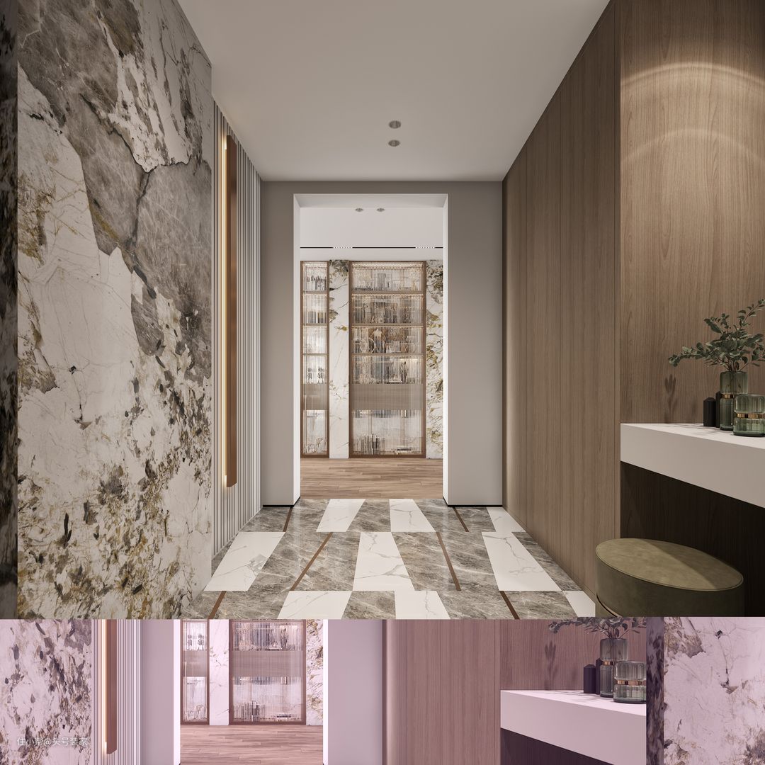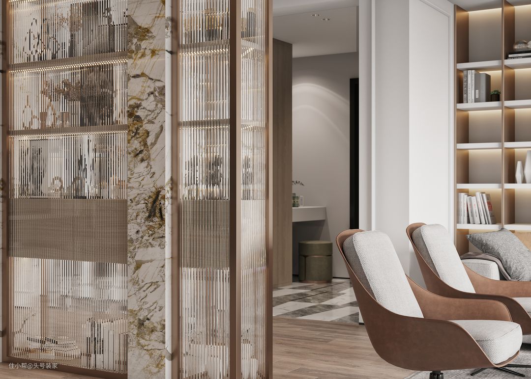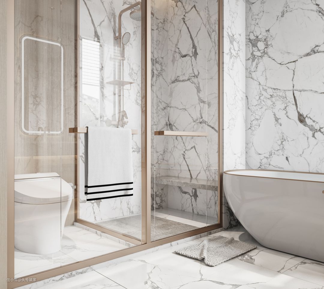 以白色和米色为主色调,搭配金色线条装饰,彰显高贵气质。大理石瓷砖地面和墙面,使空间更加宽敞明亮。透明玻璃淋浴房门设计,增加空间的通透感。整体装修注重细节与品质,呈现出一种优雅、舒适和现代化的氛围。