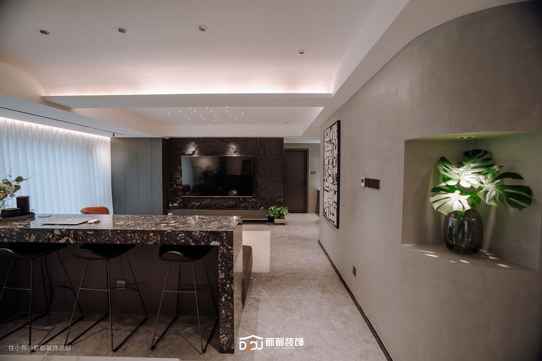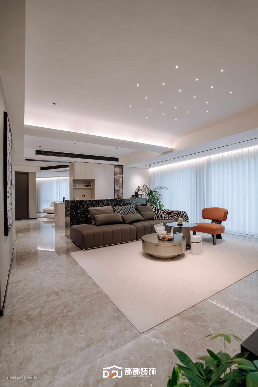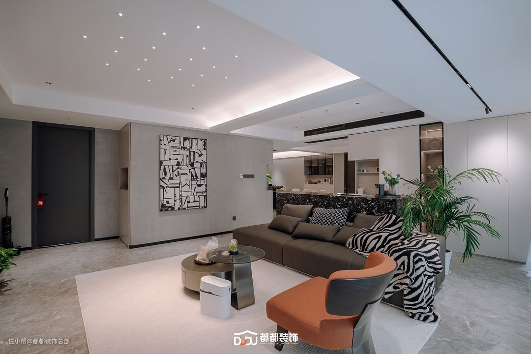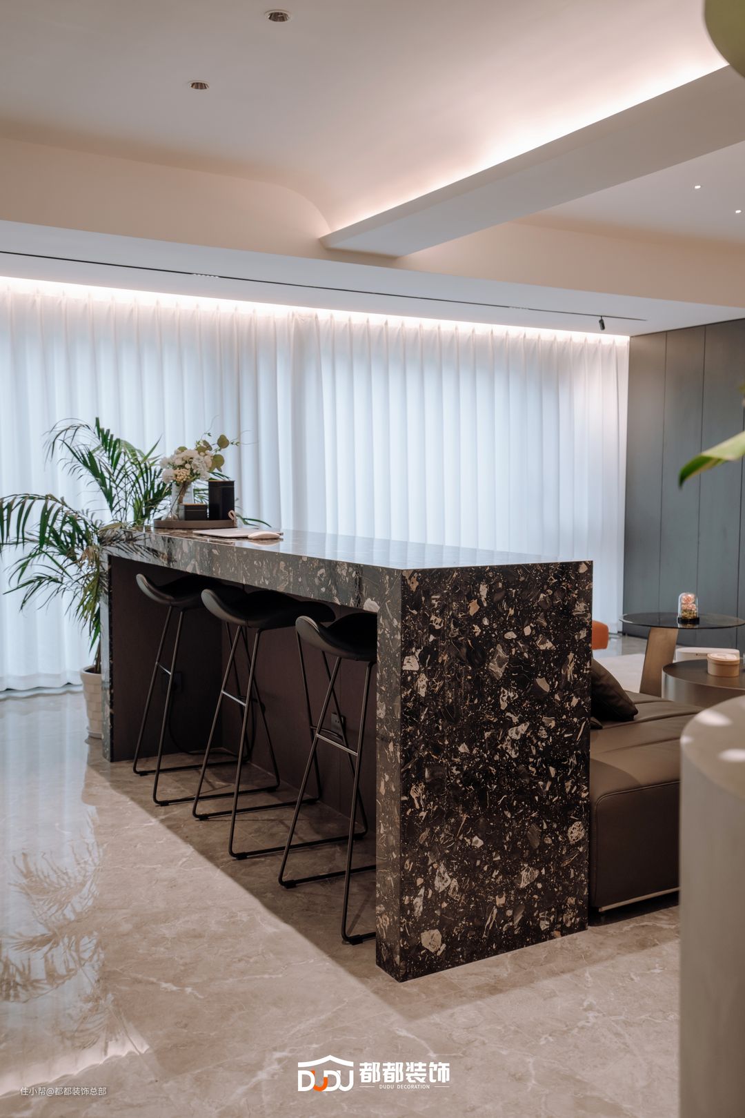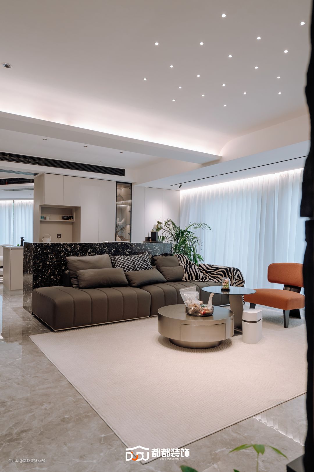 客厅选择沉敛暗色系与淡雅米色相交融,超长阳台融入客厅,引入了充沛的自然光,搭配线性灯设计,彰显时尚简约格调。琴键样式的灰色主沙发,搭配别致的双层茶几,鲜亮的橙色懒人沙发做点缀,渲染了家的文艺气质。沙发后是大理石吧台设计,极致的黑白色调达到空间的平衡,搭配灯光烘托氛围,冷暖交替又带出空间层次,让空间规整且设计更加有流动感。