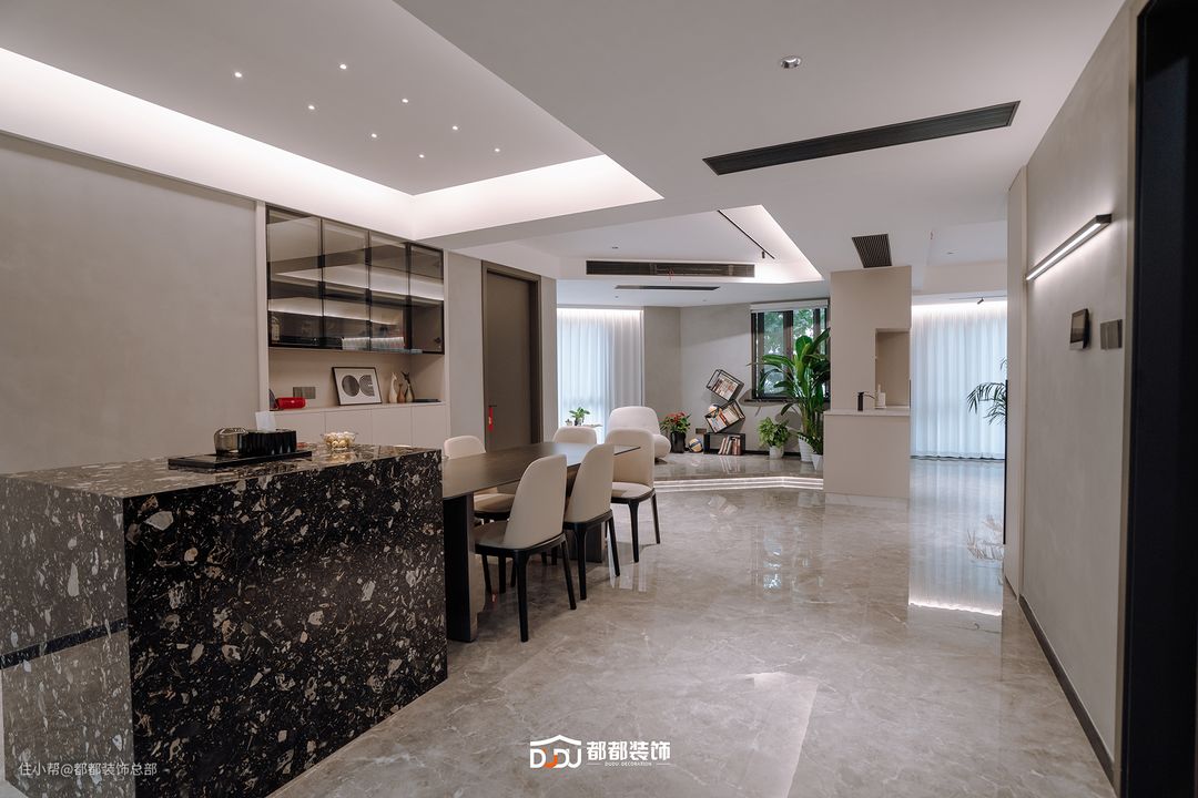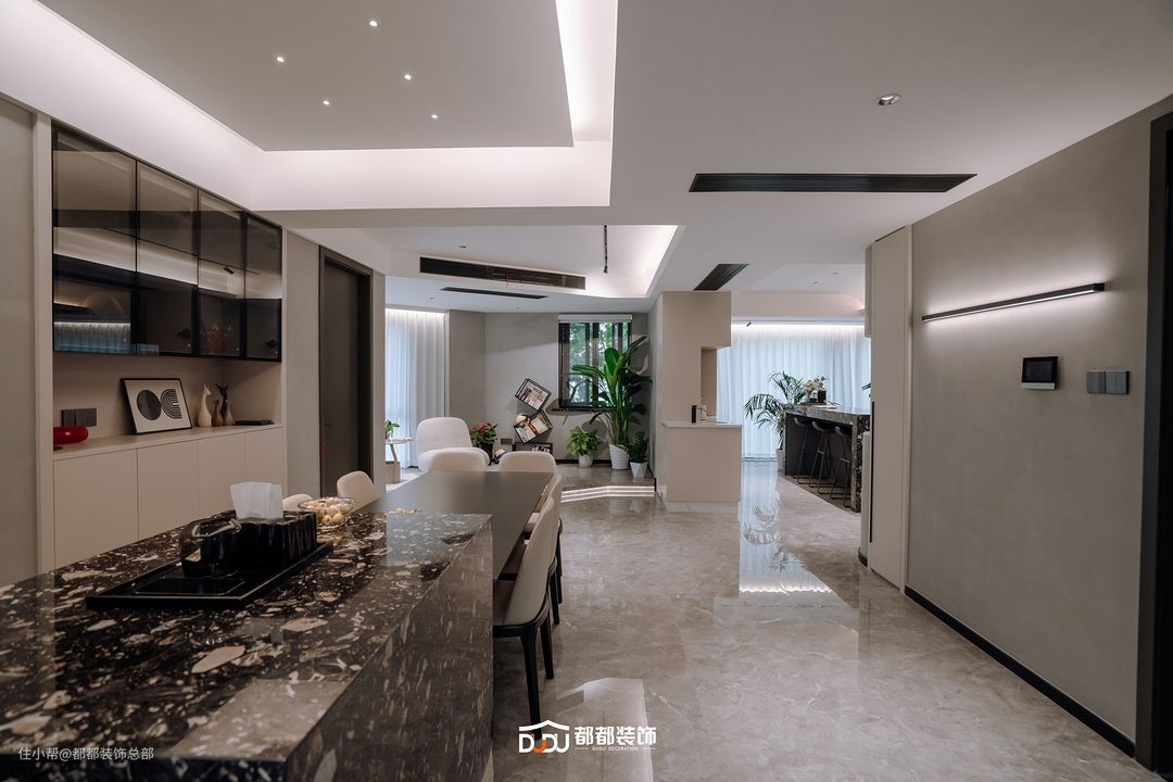 餐厅大胆采用岛台+餐桌一体设计,大理石和实木桌面的碰撞,展现出不同材质的魅力,靠墙餐边柜内嵌的灰色玻璃柜,汇聚展示、收纳等多种功能,满足现代都市人的多维需求。