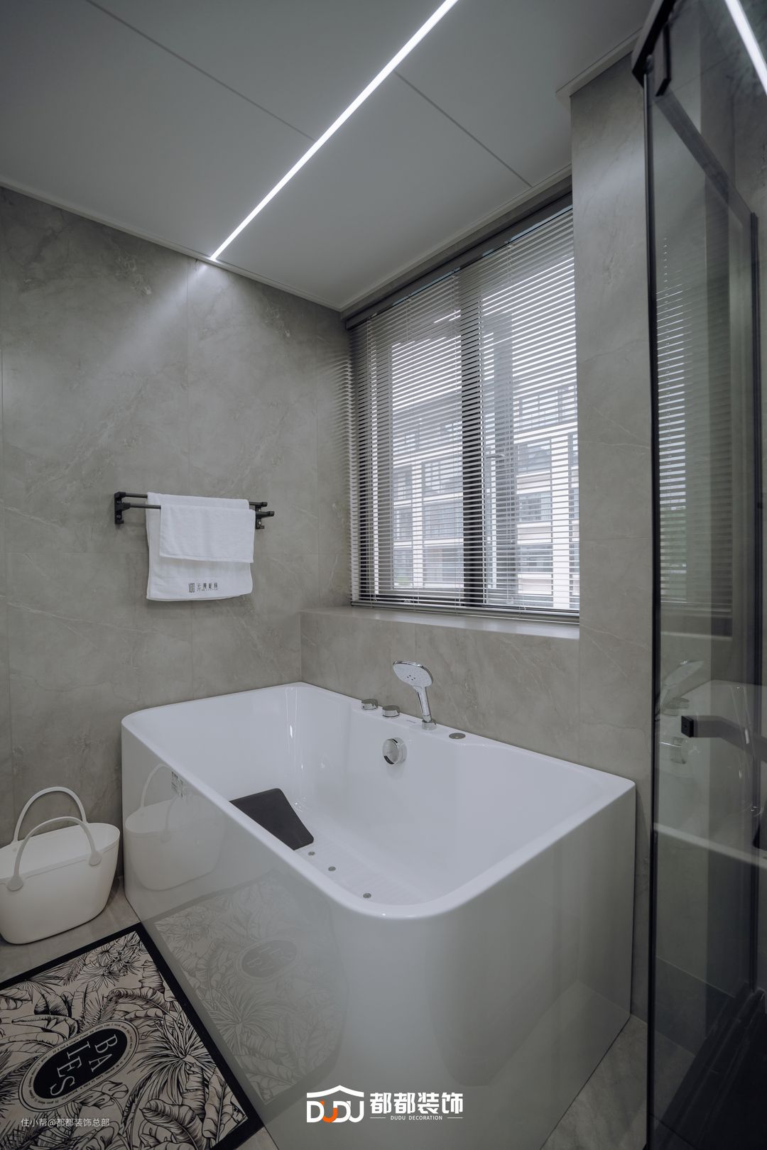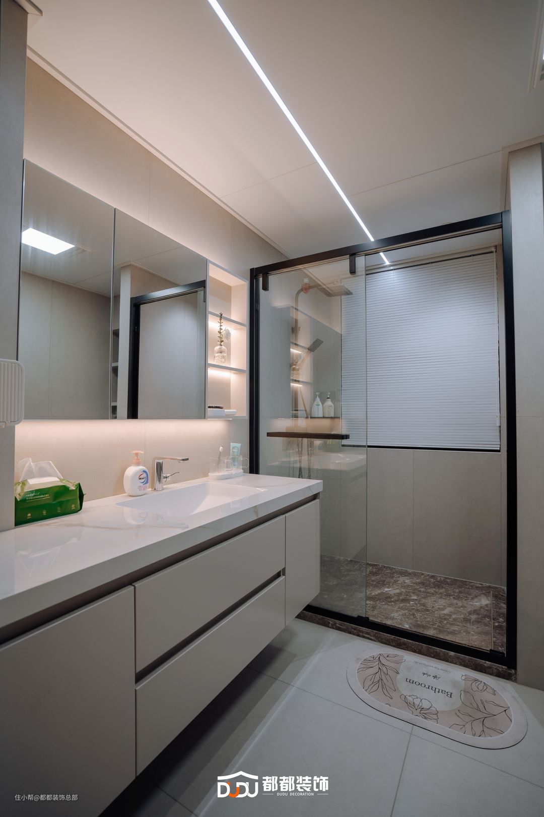 卫生间干湿分区,淋浴间使用两折推拉门设计,开门时都梭到一边,洗澡也更方便,镜柜和洗手柜的收纳能力超强,幸福感倍增,镜柜嵌入灯带让空间明亮、温馨,大浴缸满足女主人的泡澡需求!