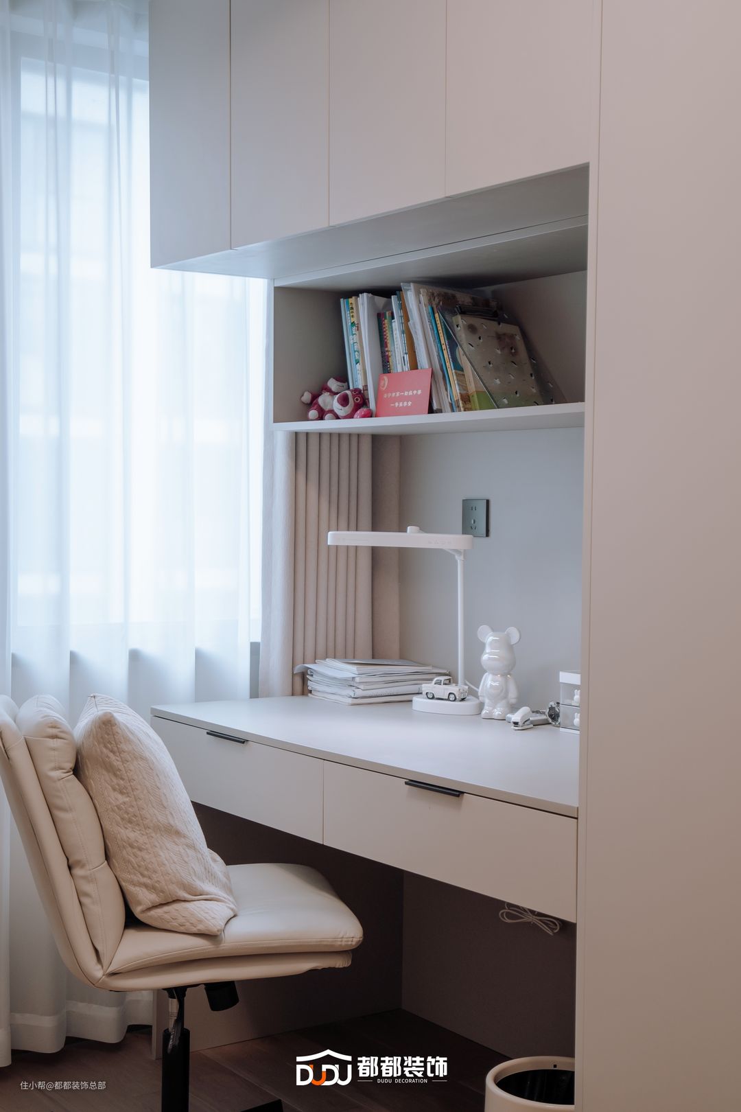 主卧以奶油杏色为主基调,半墙木饰面背景搭配软包床头板,双窗增加采光,一旁摆置同款成品柜,满足空间基本收纳需求。 靠窗打造加长书桌板,实现空间的多功能性,另一侧定制整面衣柜,柜体整体使用浅米色,柔和地洒落室内,轻易享受这样的沉浸式办公/换装体验。
