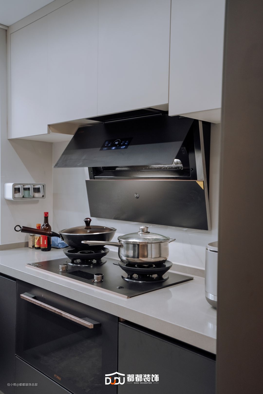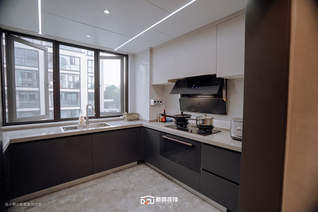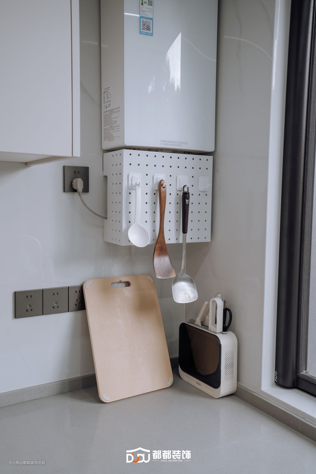 厨房采用U型设计,正中央靠窗为洗涤区,两边为烹饪区和操作台,分区明确,白色无把手橱柜和浅金色台面,维持了简净的美感,也保留了多维的收纳功能!调料上墙,洞洞板收纳挂勺,简单勾勒了家的温馨场景!