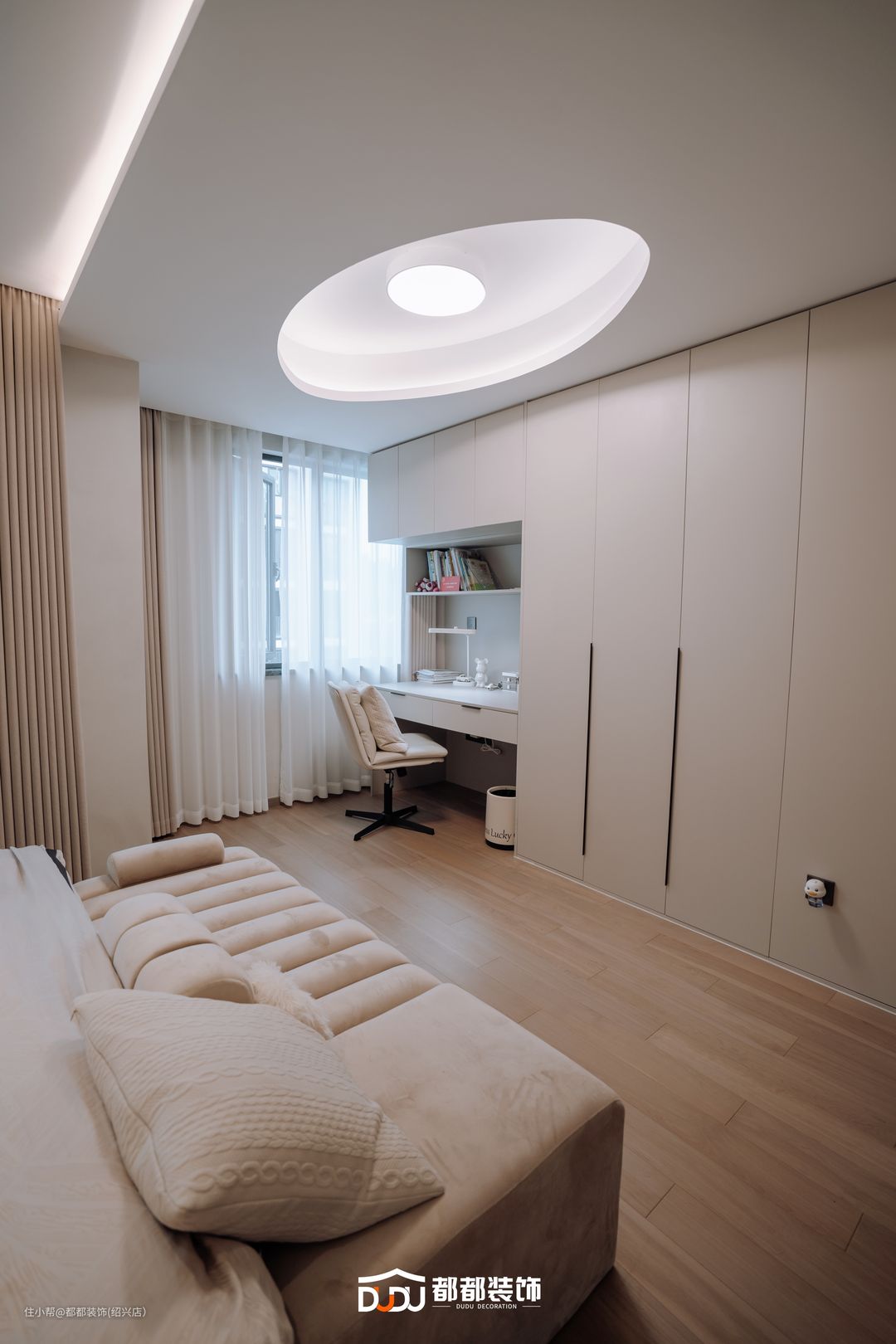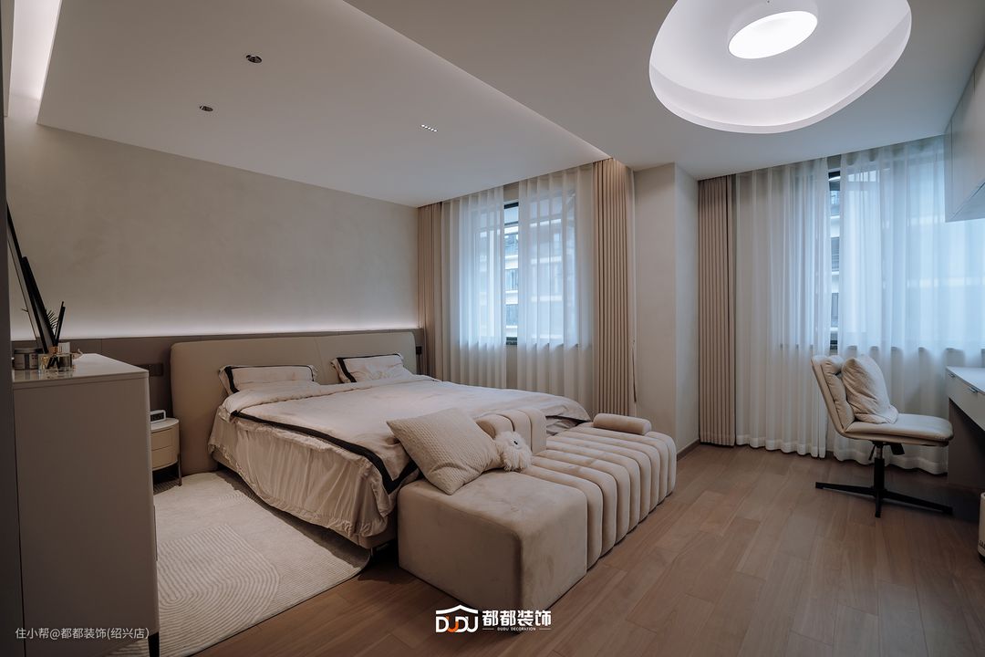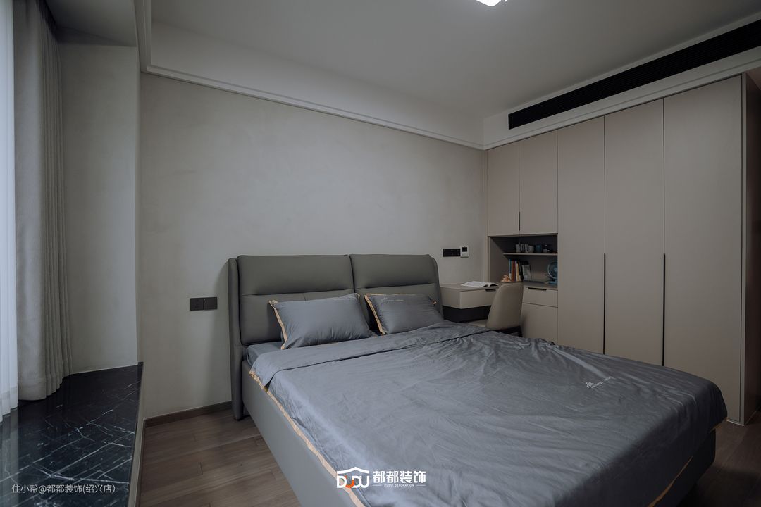 主卧以奶油杏色为主基调,半墙木饰面背景搭配软包床头板,双窗增加采光,一旁摆置同款成品柜,满足空间基本收纳需求。 靠窗打造加长书桌板,实现空间的多功能性,另一侧定制整面衣柜,柜体整体使用浅米色,柔和地洒落室内,轻易享受这样的沉浸式办公/换装体验。