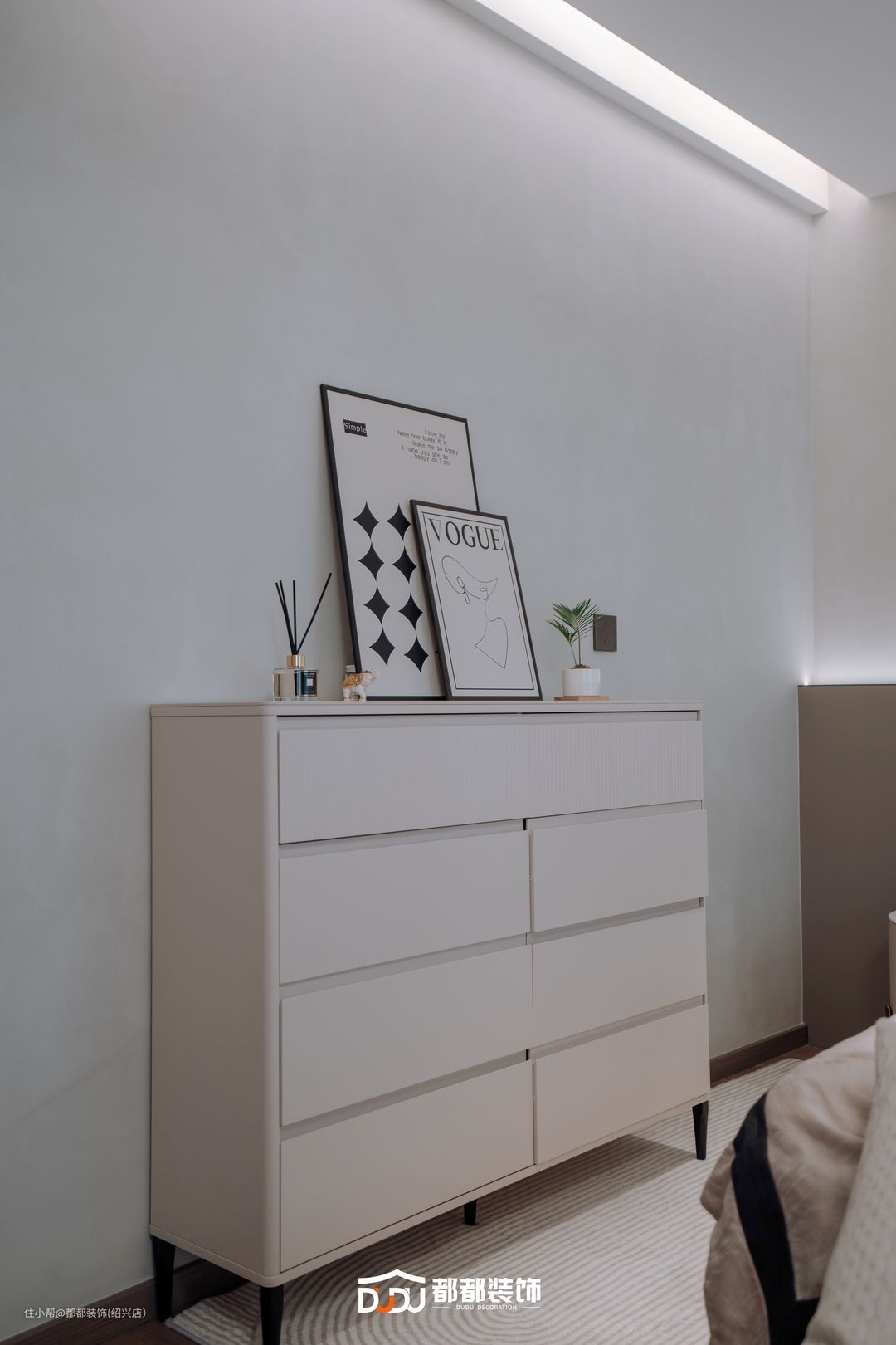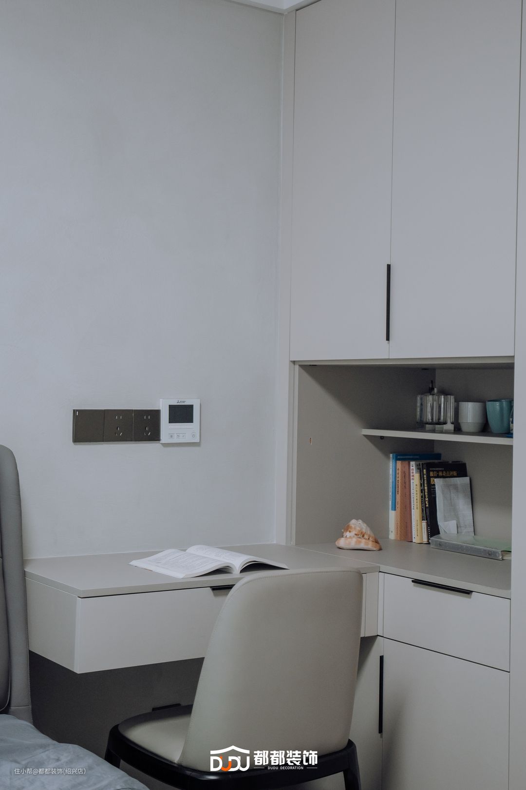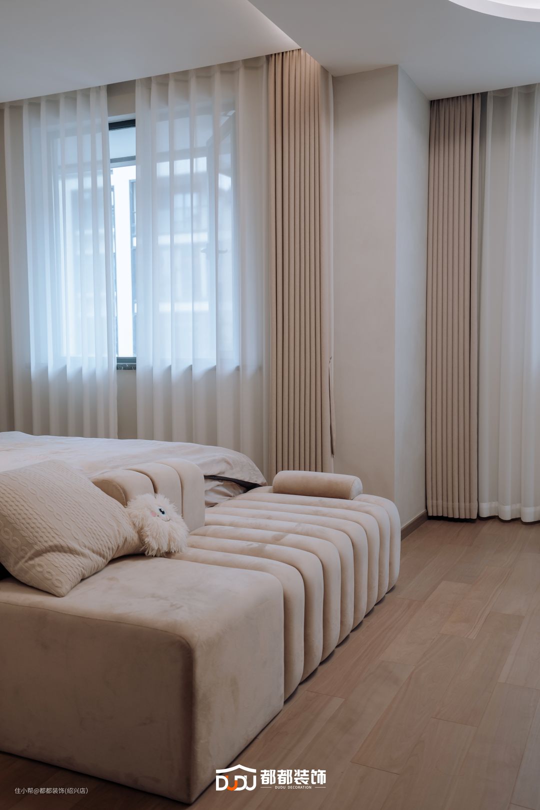 主卧以奶油杏色为主基调,半墙木饰面背景搭配软包床头板,双窗增加采光,一旁摆置同款成品柜,满足空间基本收纳需求。 靠窗打造加长书桌板,实现空间的多功能性,另一侧定制整面衣柜,柜体整体使用浅米色,柔和地洒落室内,轻易享受这样的沉浸式办公/换装体验。