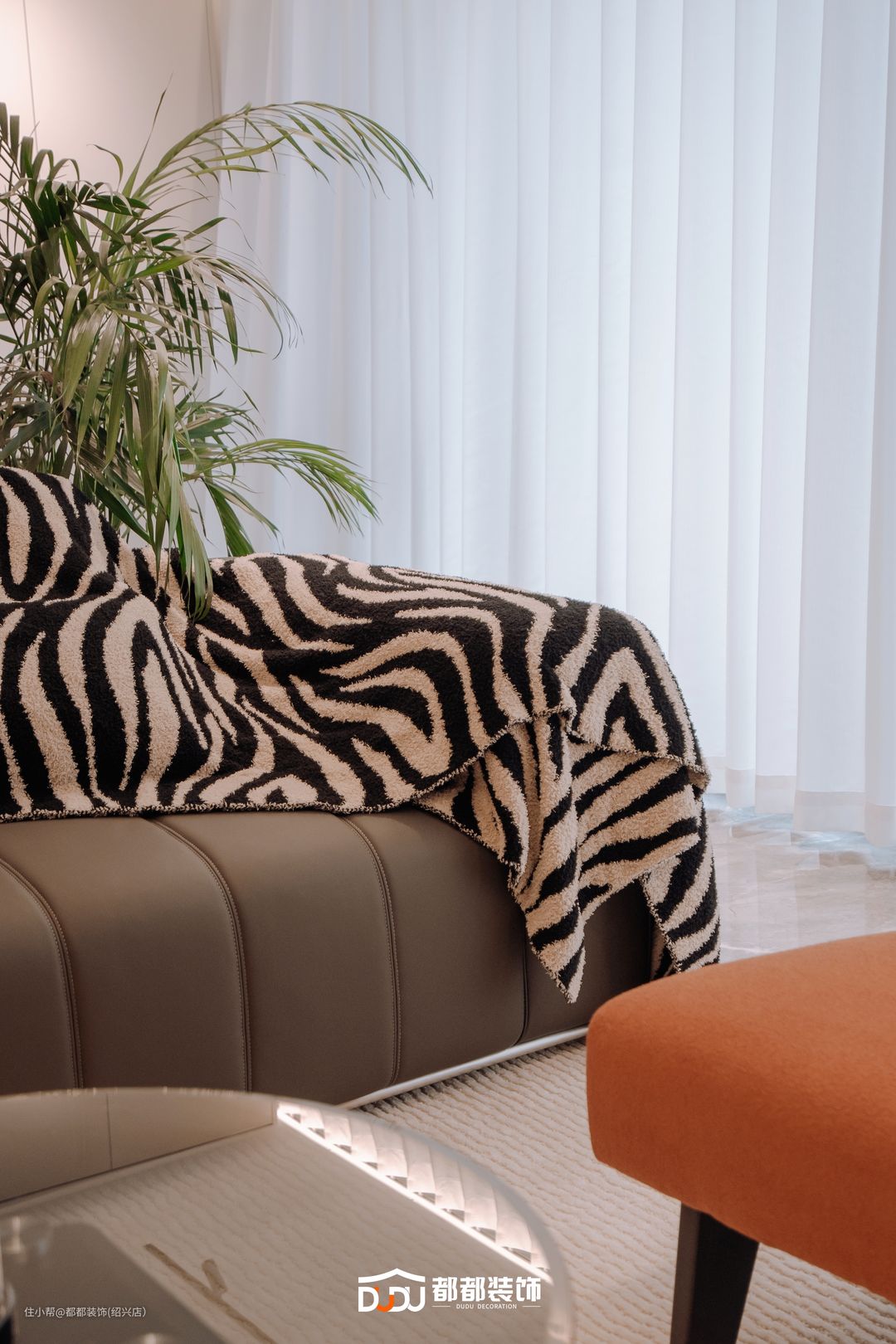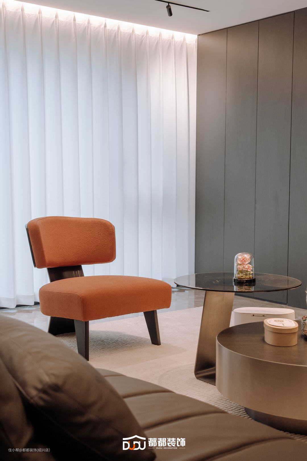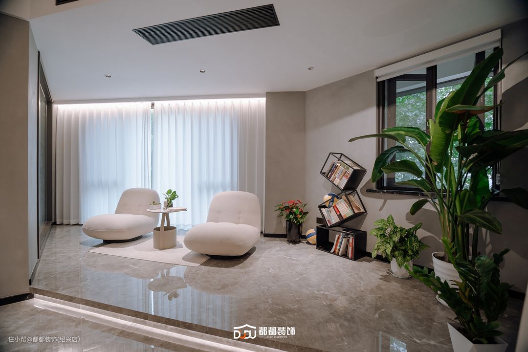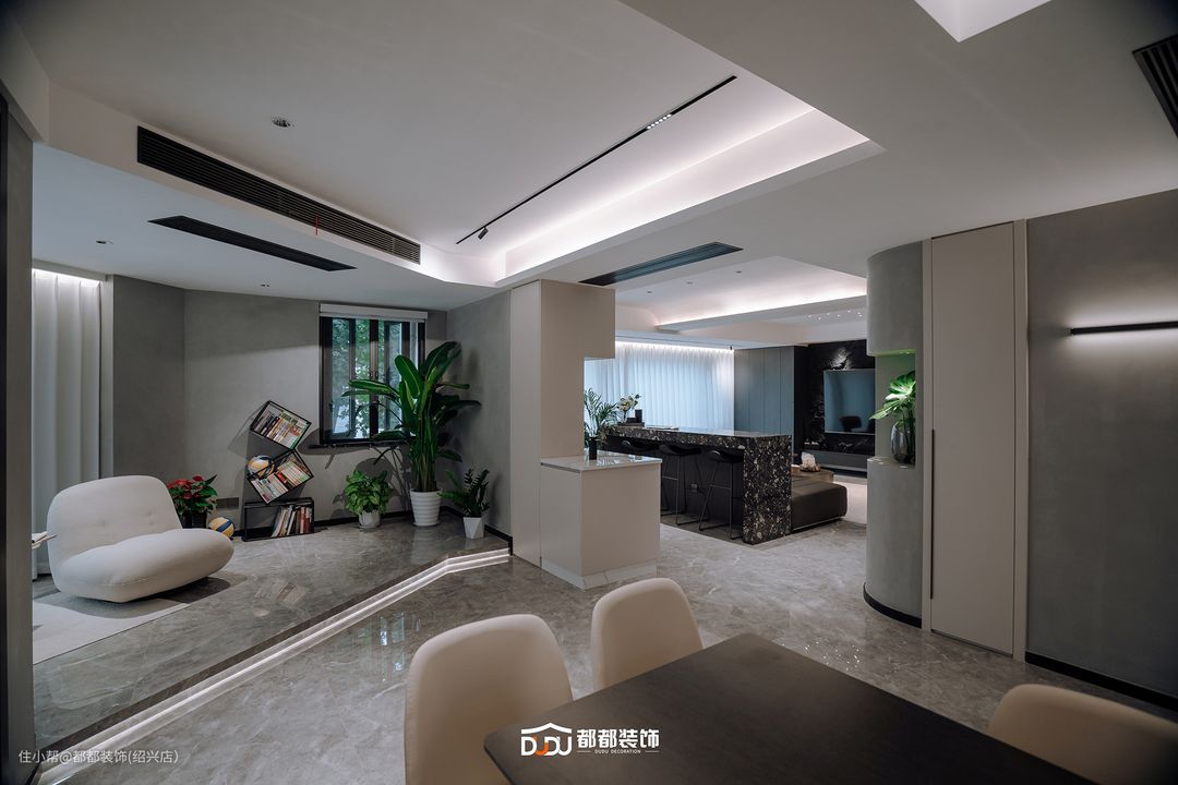 客厅选择沉敛暗色系与淡雅米色相交融,超长阳台融入客厅,引入了充沛的自然光,搭配线性灯设计,彰显时尚简约格调。琴键样式的灰色主沙发,搭配别致的双层茶几,鲜亮的橙色懒人沙发做点缀,渲染了家的文艺气质。沙发后是大理石吧台设计,极致的黑白色调达到空间的平衡,搭配灯光烘托氛围,冷暖交替又带出空间层次,让空间规整且设计更加有流动感。