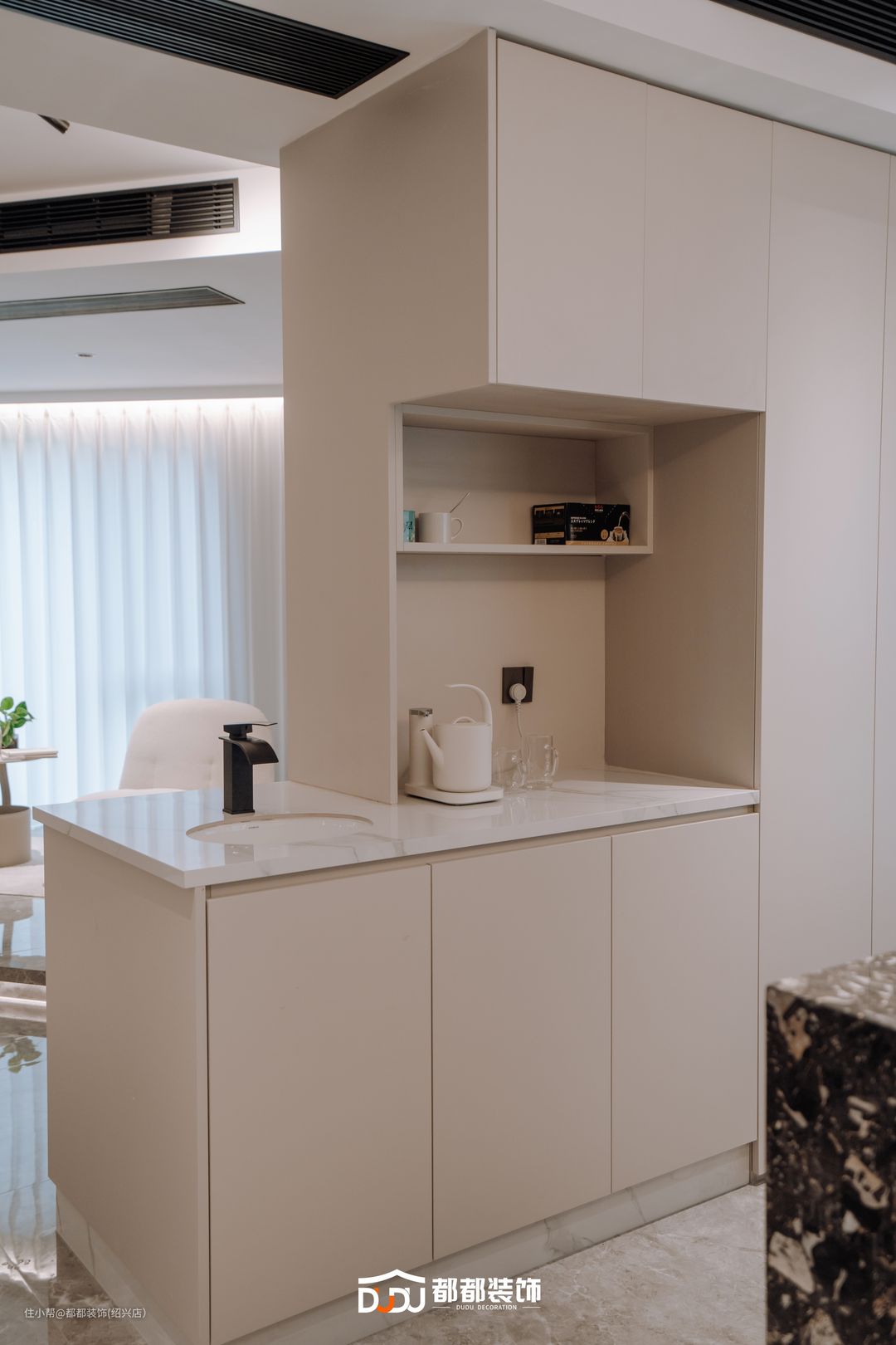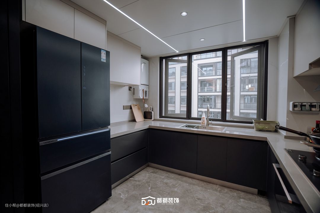 厨房采用U型设计,正中央靠窗为洗涤区,两边为烹饪区和操作台,分区明确,白色无把手橱柜和浅金色台面,维持了简净的美感,也保留了多维的收纳功能!调料上墙,洞洞板收纳挂勺,简单勾勒了家的温馨场景!