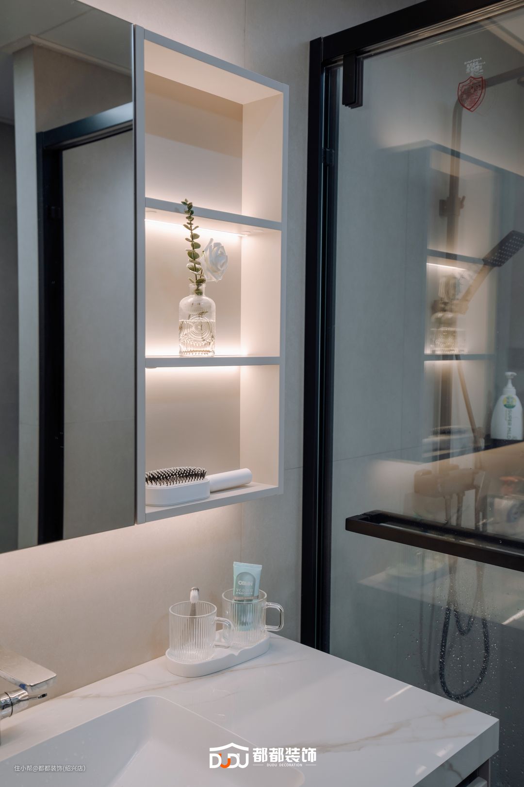 卫生间干湿分区,淋浴间使用两折推拉门设计,开门时都梭到一边,洗澡也更方便,镜柜和洗手柜的收纳能力超强,幸福感倍增,镜柜嵌入灯带让空间明亮、温馨,大浴缸满足女主人的泡澡需求!