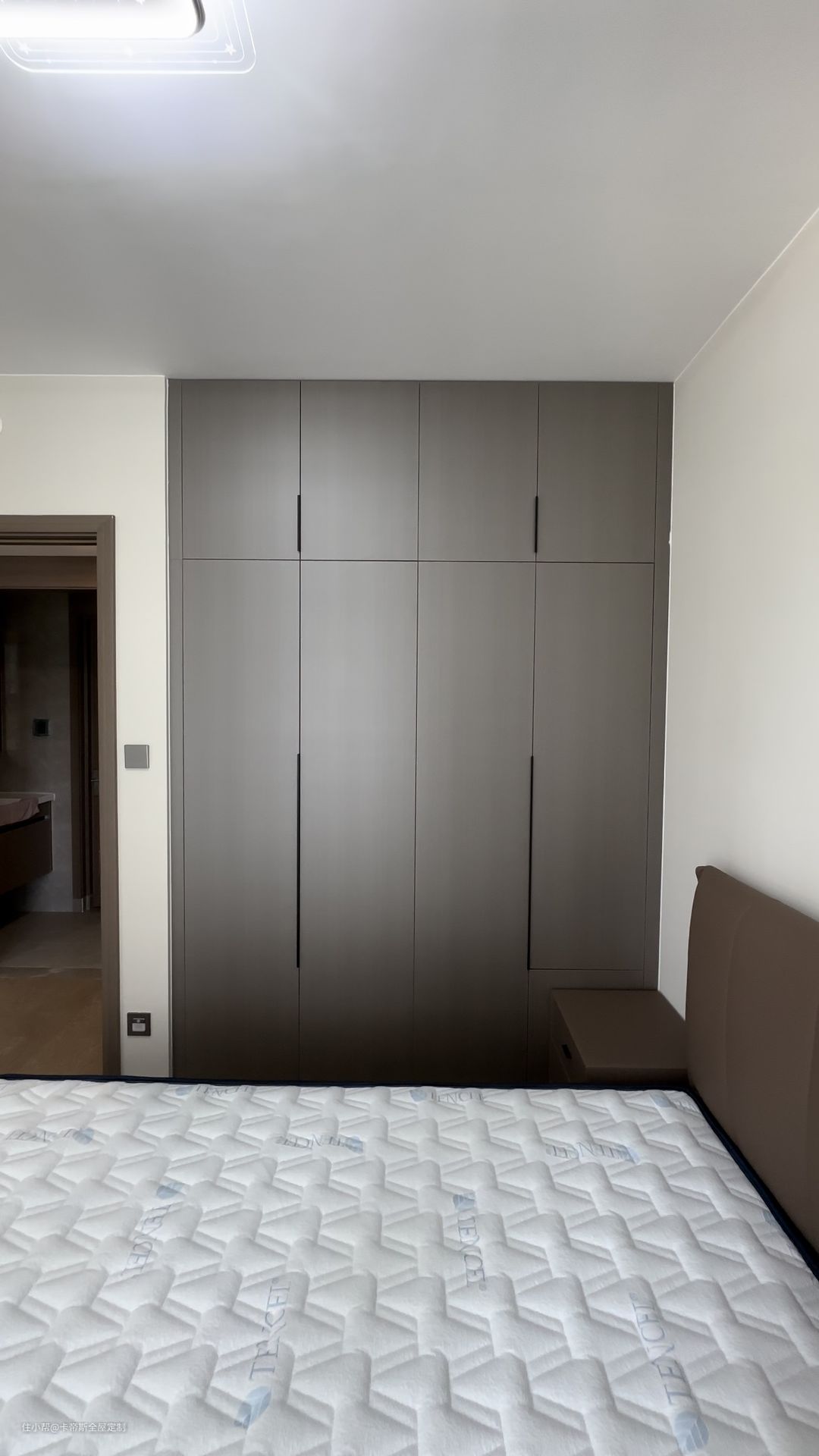 次卧衣柜做了分段式处理,衣柜的尺寸和布局通常会根据您的主卧室大小和形状进行设计。它可以采用吊挂区域、抽屉、搁板、鞋架等组合,以提供不同类型的储存空间。