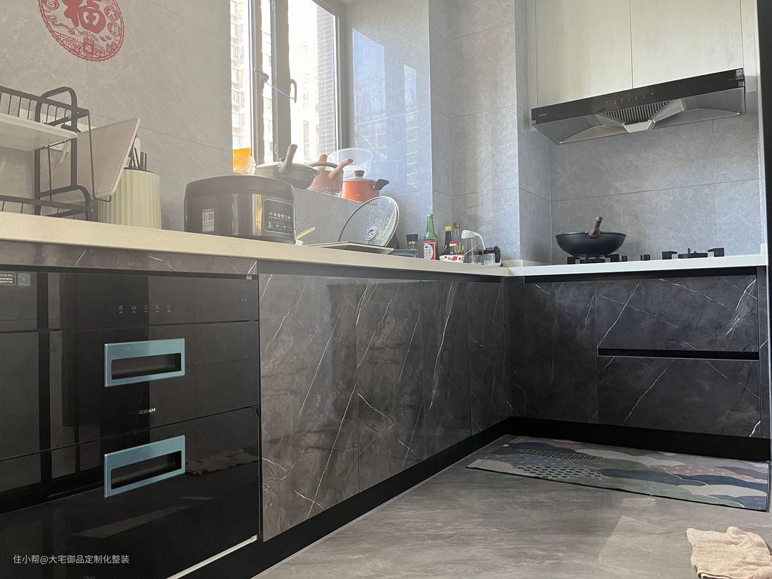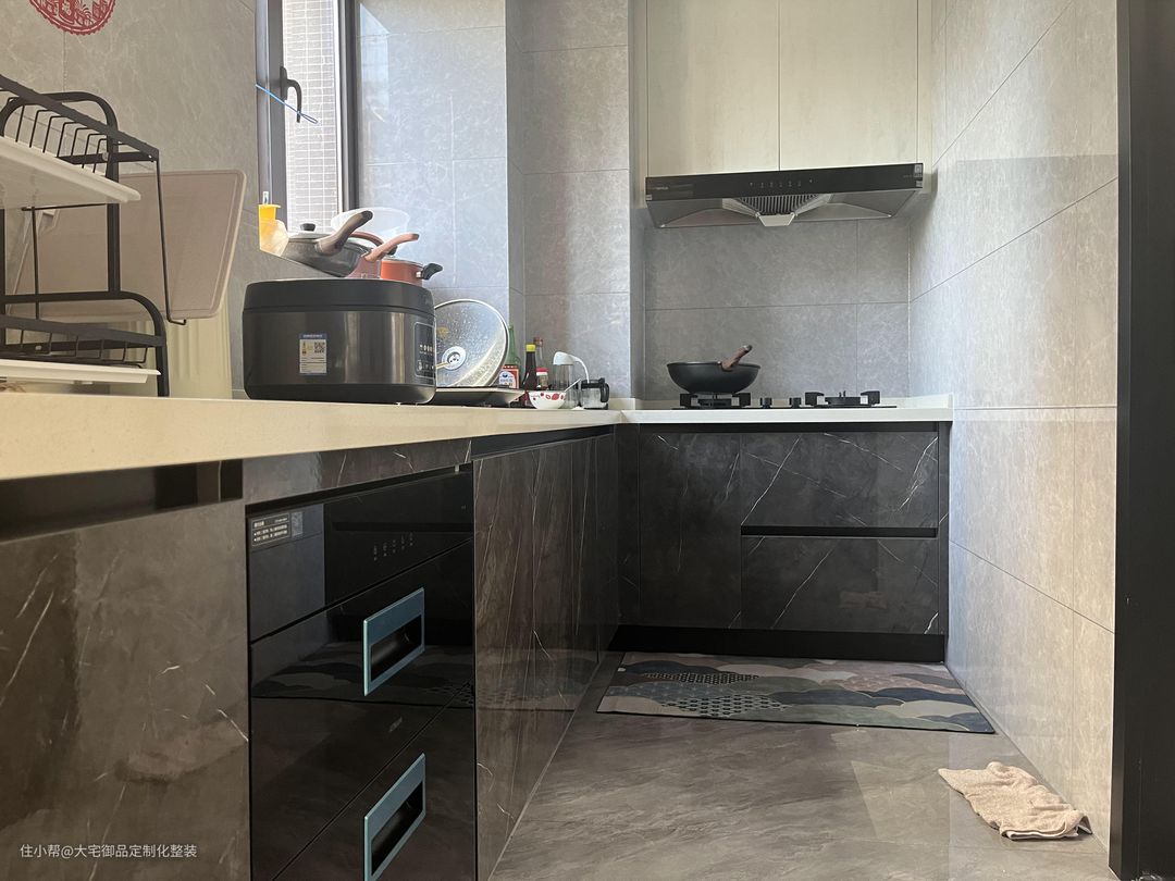 厨房采用白色和深灰色大理石面板,搭配L型定制集成灶台,提高功能性的同时又方便清洁打理。