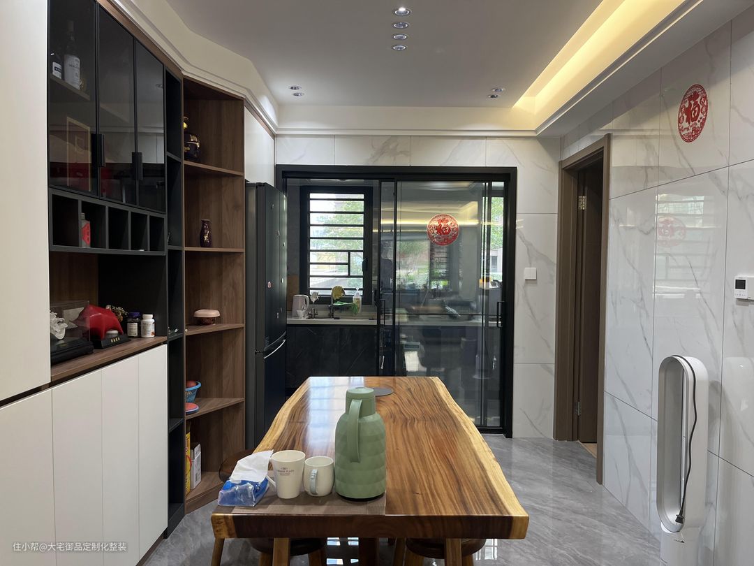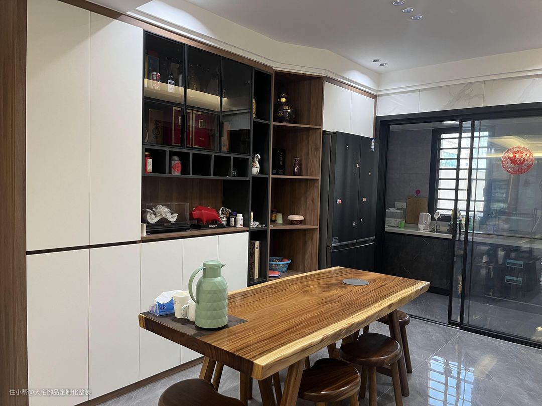 餐厅沿用客厅的主色调,搭配欧派定制柜、木饰面展示柜和原木餐桌,提升空间层次感的同时,增加了空间质感。