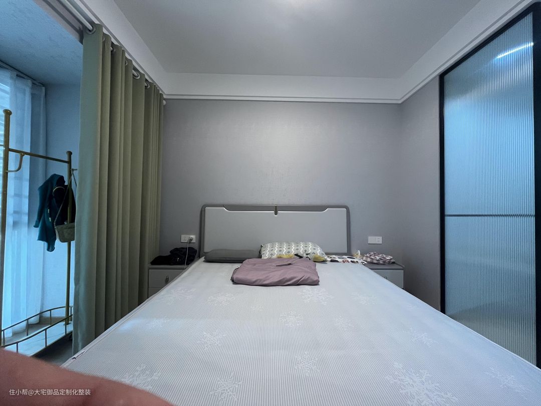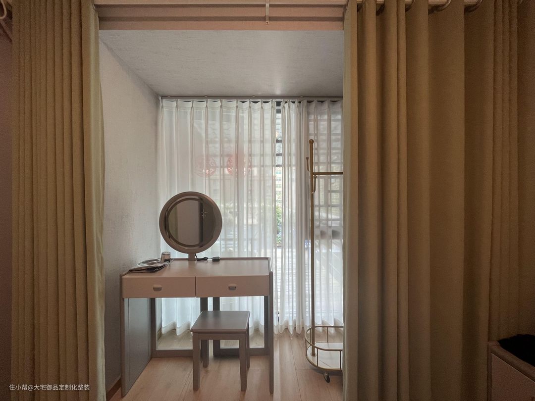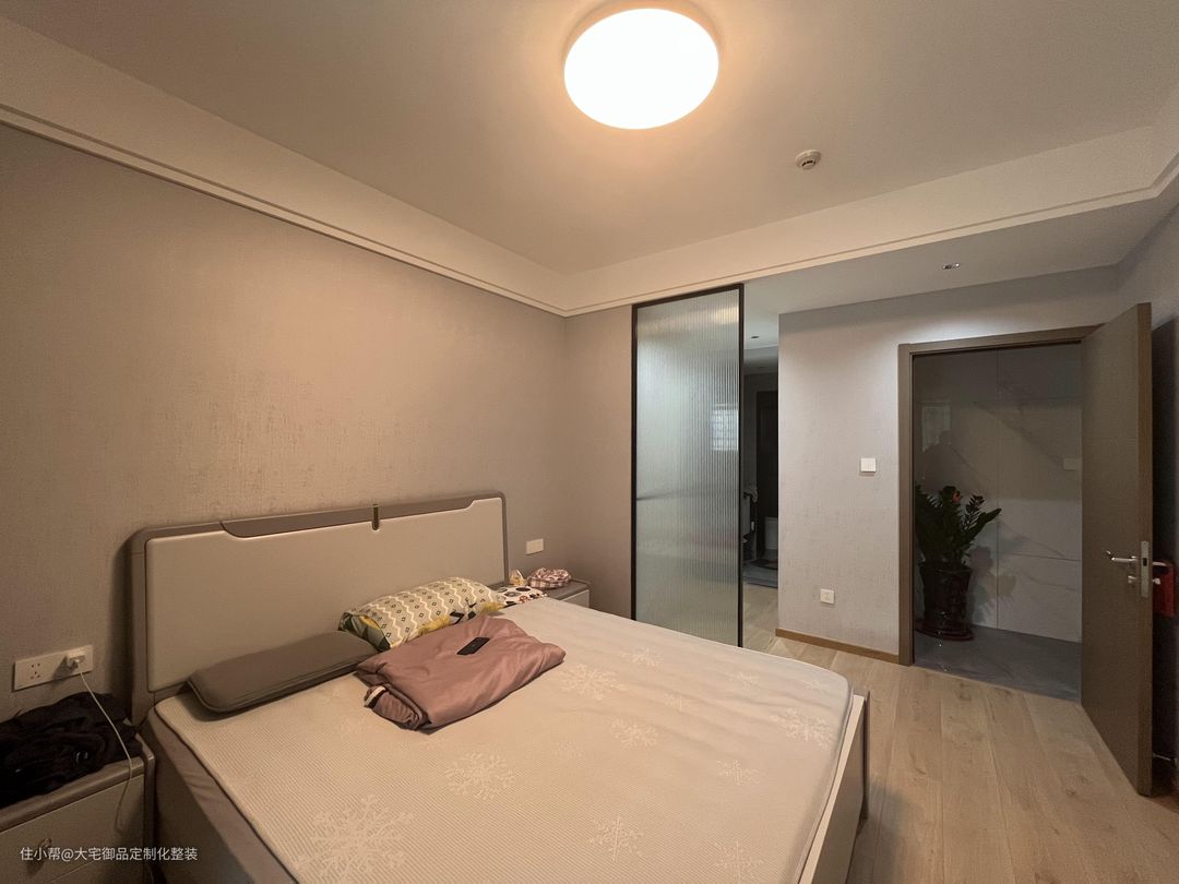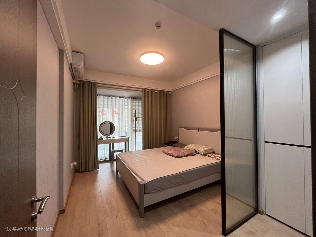 主卧墙面采用白色艺术漆,地面采用木饰面地板,使得主卧整体温馨整洁,通过窗帘隔开梳妆台,玻璃幕墙隔开衣帽间和卫生间,起到美观效果的同时又明确空间区域的划分。