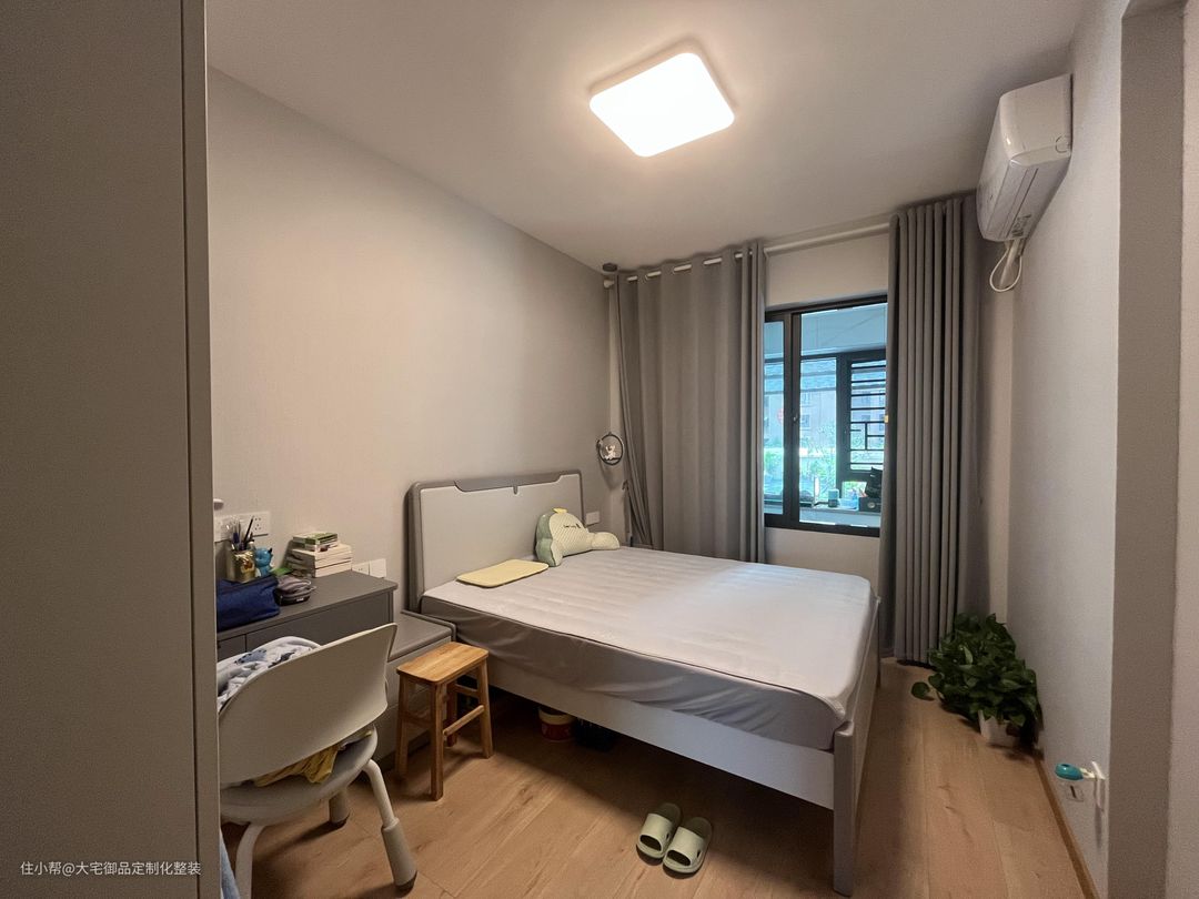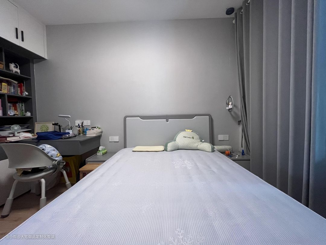 男孩房沿用主卧的主色调,搭配定制橱柜书桌,提高空间利用率的同时又提高了收纳能力。整体明亮舒适的氛围也比较适合孩子的功课学习。