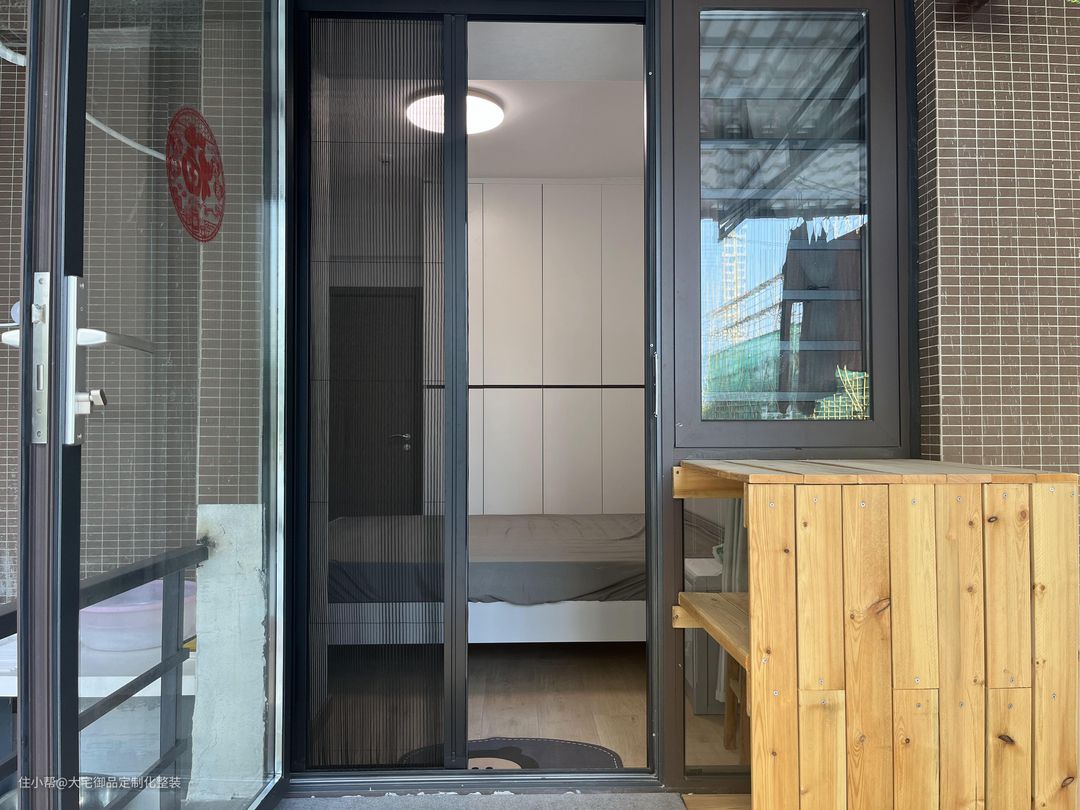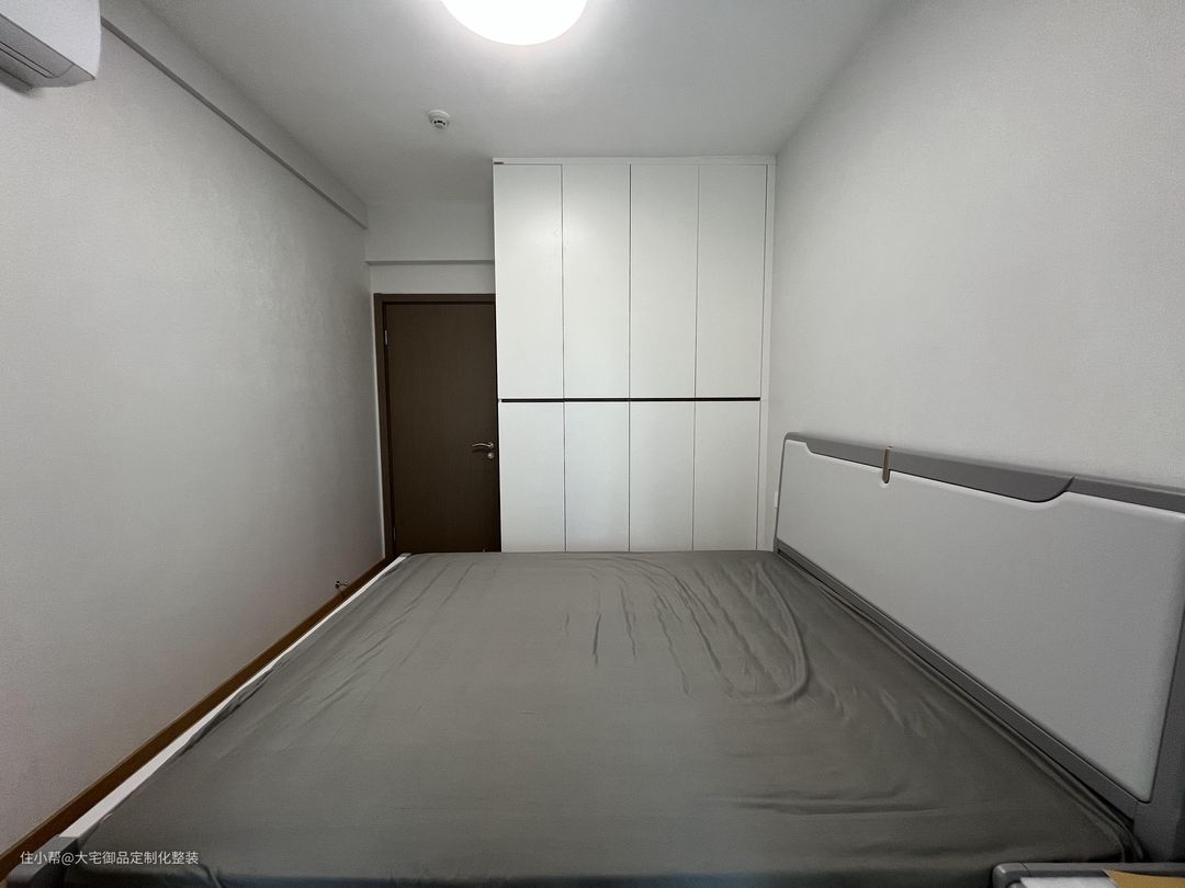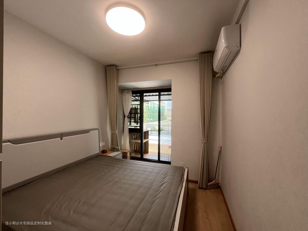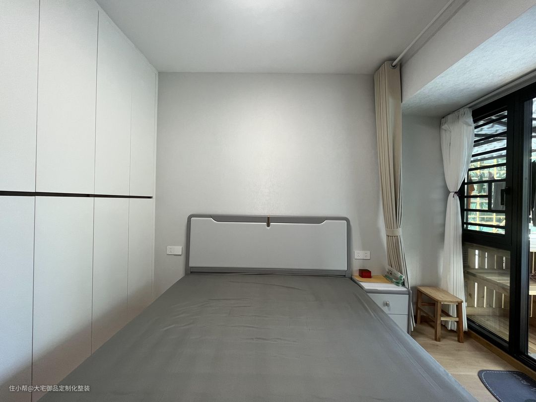 次卧沿用主卧的色调和设计,在较小的空间搭配欧派定制柜,提高收纳能力,通过落地窗玻璃门连通阳台,提高通风和采光的同时,提供一个活动和晾衣服的空间。