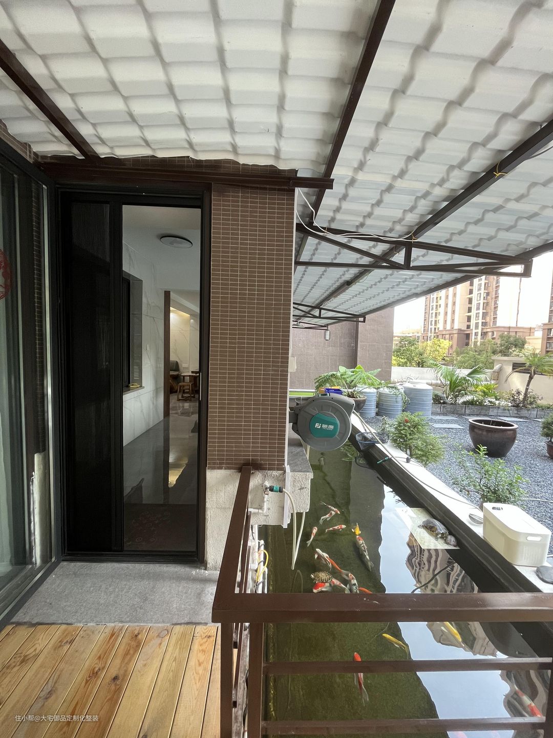 业主购买了二楼的大露台,改造成露天大阳台,搭配养鱼池和铺设大理石木地板,起到美观的同时,提供了一个可以聚餐乘凉的露天空间。