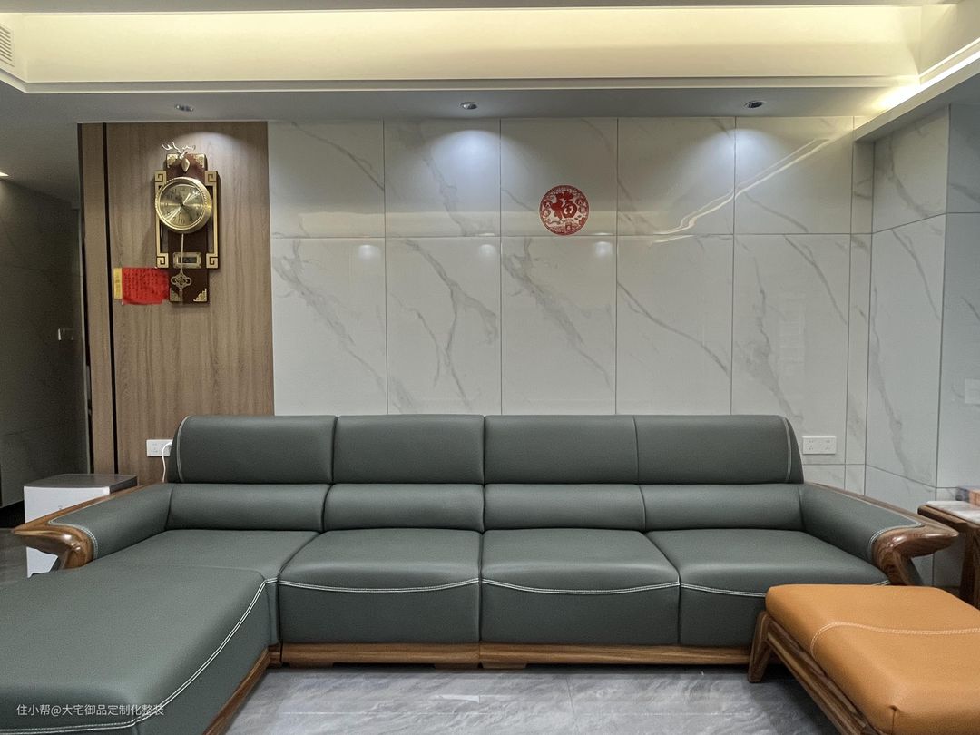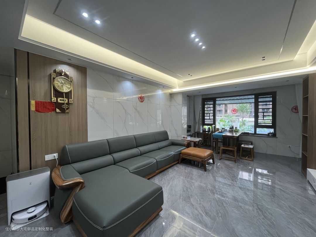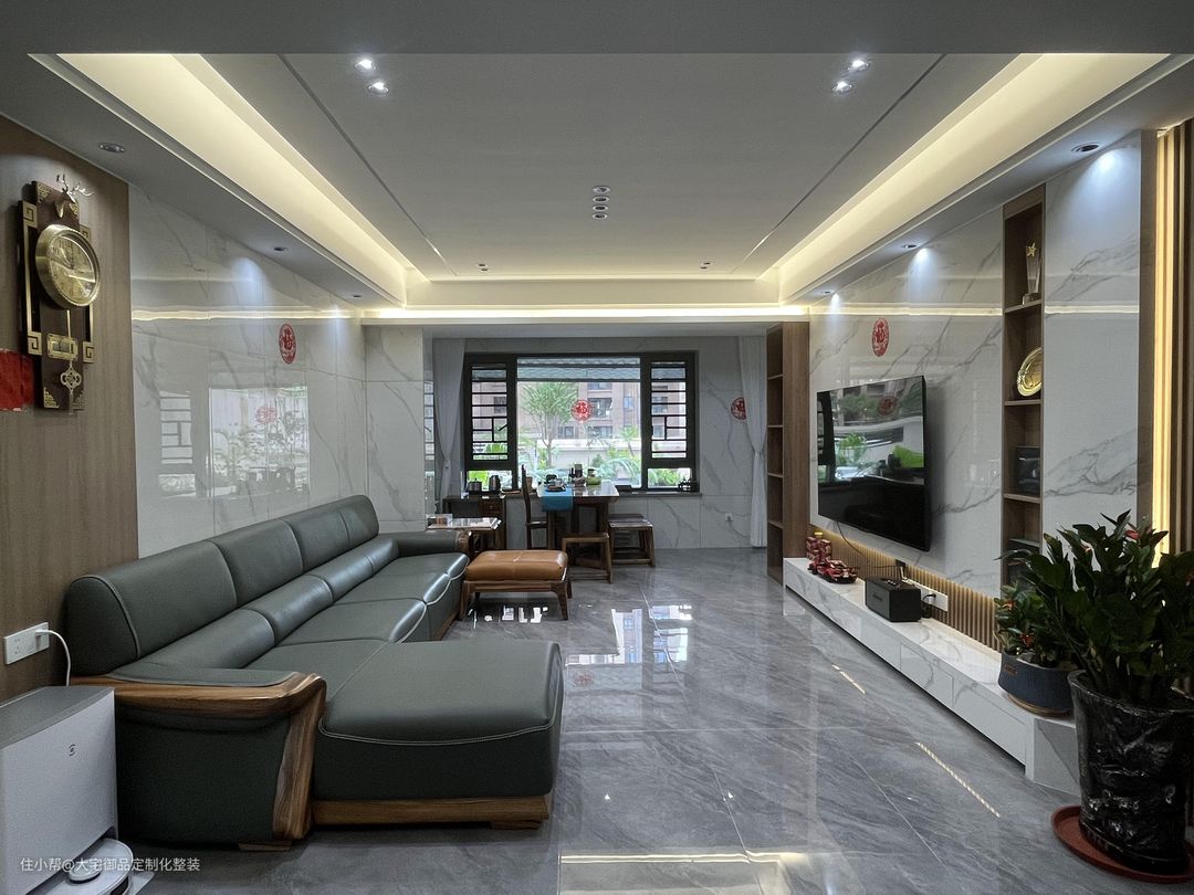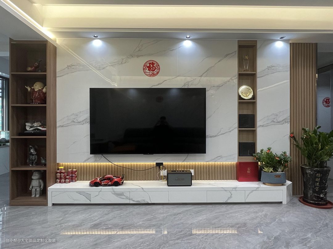 整体采用白色为主色调,选用亮面大理石面砖和墙面,采用无主灯式设计,加装隐藏式灯带、磁吸灯和射灯,使得整体空间明亮大气,搭配吊钟等黄铜摆件,提升空间质感。