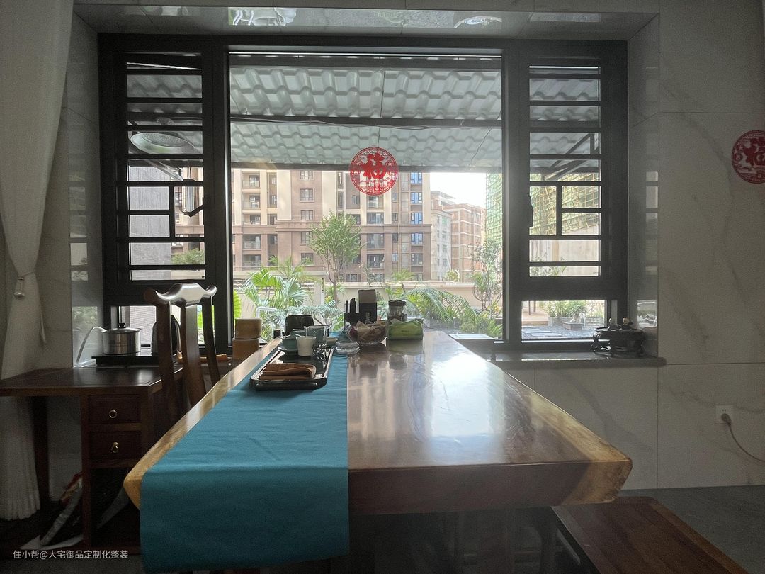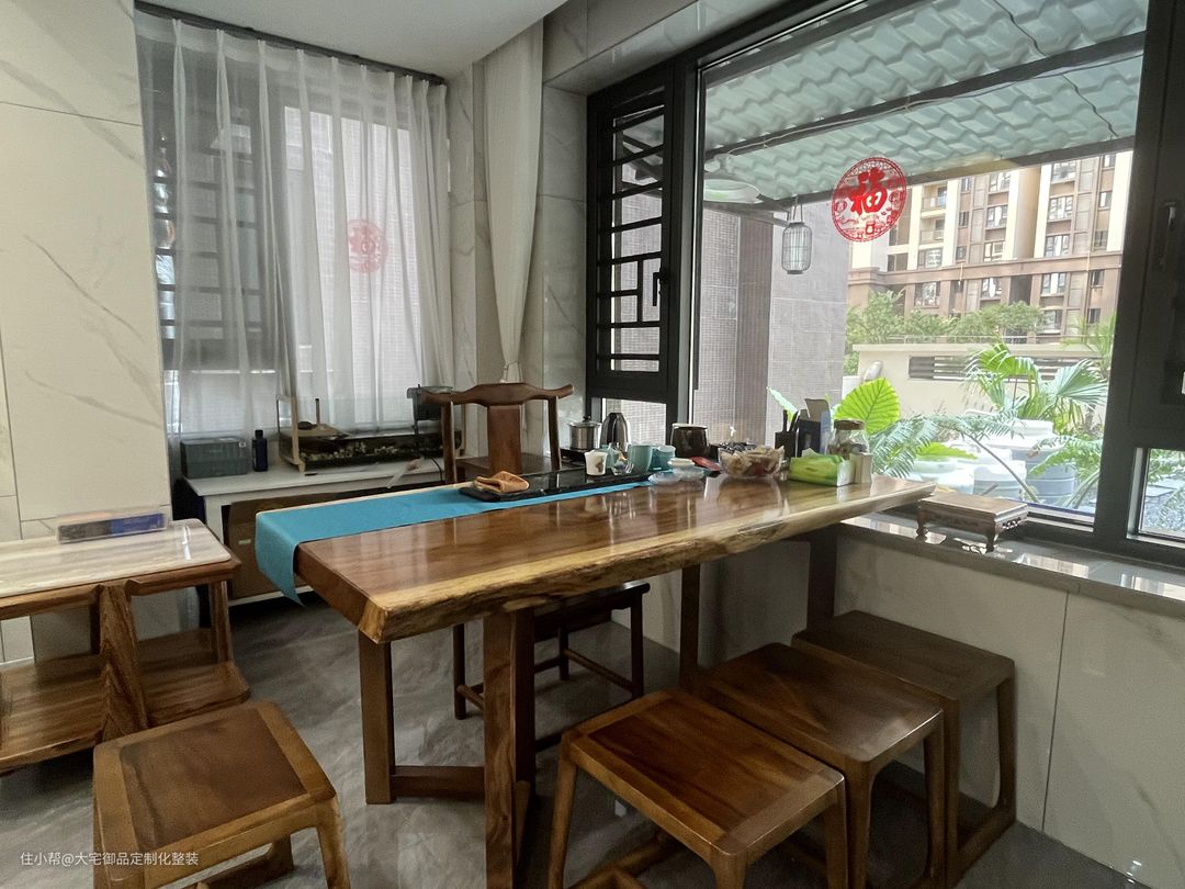 泡茶区连通客厅,搭配纱窗靠近阳台窗,采光通风良好,搭配实木茶桌椅,带来古朴宁静的休闲泡茶气息。