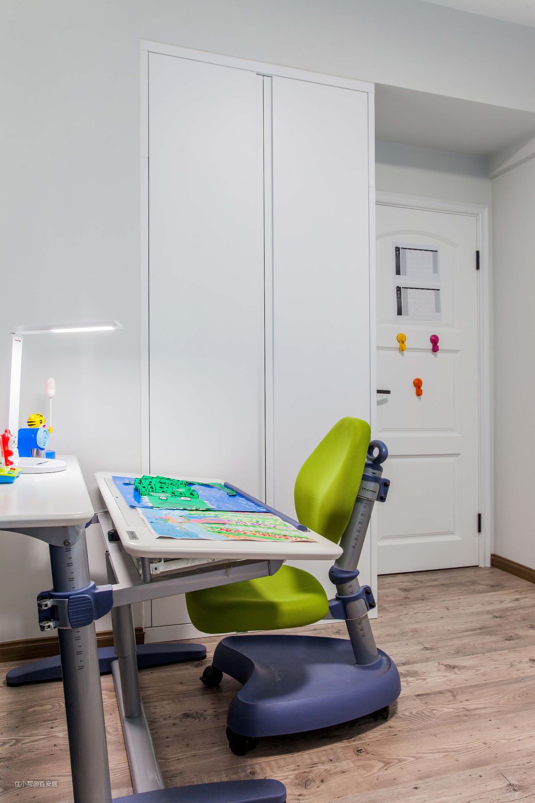 主卧打破了常规的布置方式,我们靠床头布置了书桌与书柜,白衣柜摆放到了另一个位置,让我们有眼前一亮的效果。灰色与柠檬黄的搭配也给予了更大的视觉冲击。
