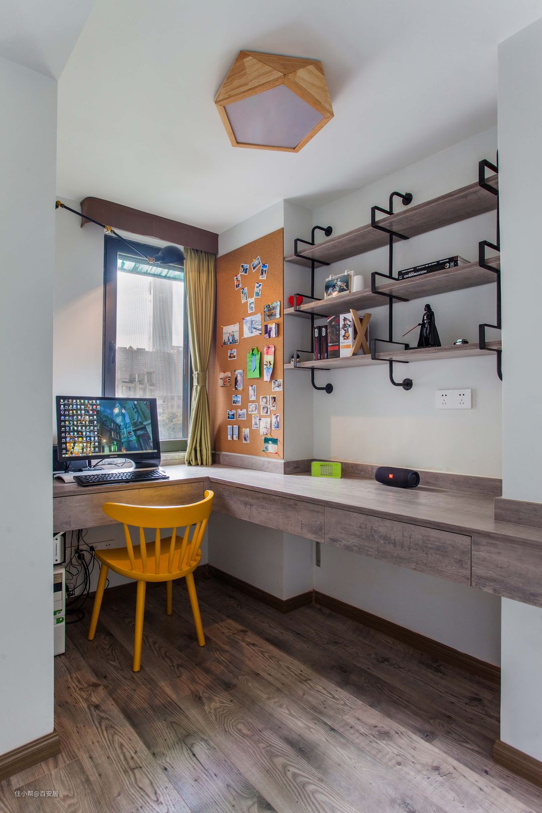 L型的书桌充分利用了空间,可以同时满足家里2个人同时办公,墙面凹进去的位置,安装了与书桌同色的层板,用黑色支架固定简约大方有着浓浓的工业风。另一边榻榻米的设计可以让家人们围在一起看书,喝茶,娱乐。