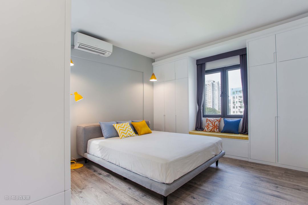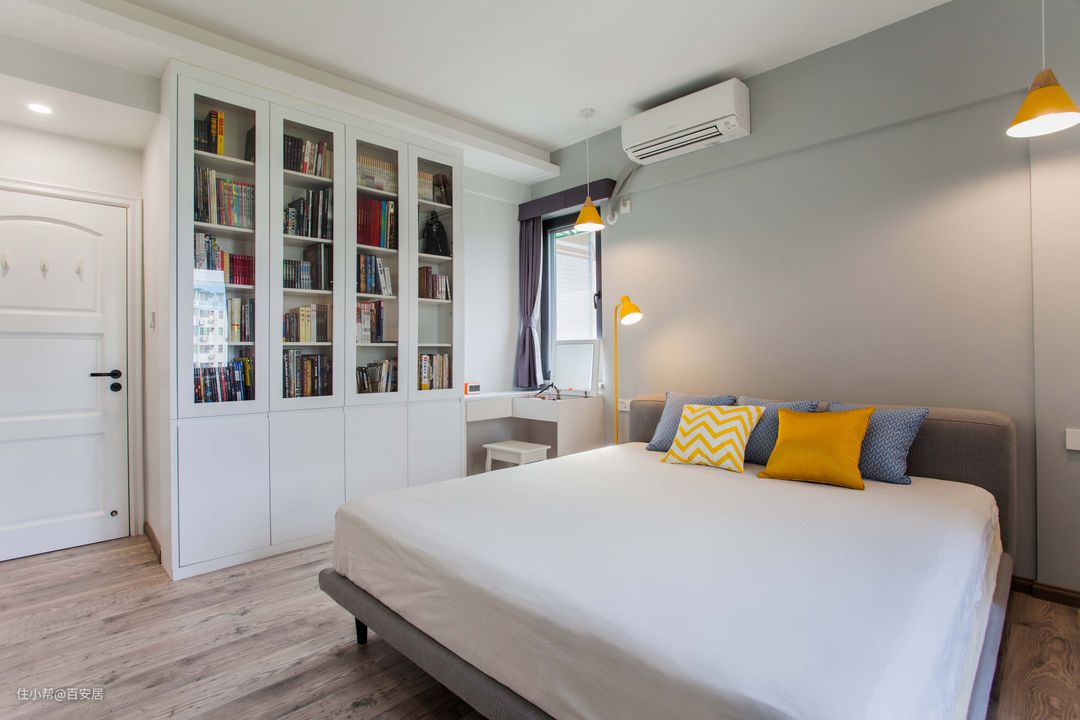 主卧打破了常规的布置方式,我们靠床头布置了书桌与书柜,白衣柜摆放到了另一个位置,让我们有眼前一亮的效果。灰色与柠檬黄的搭配也给予了更大的视觉冲击。