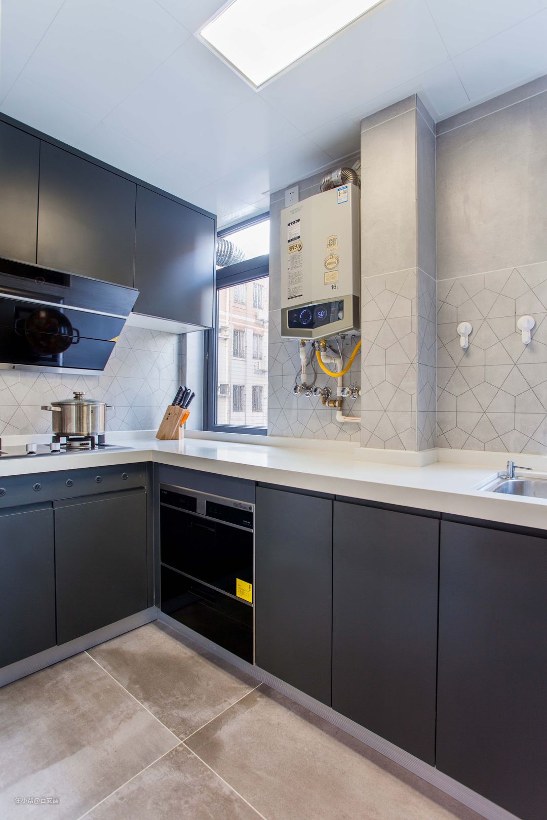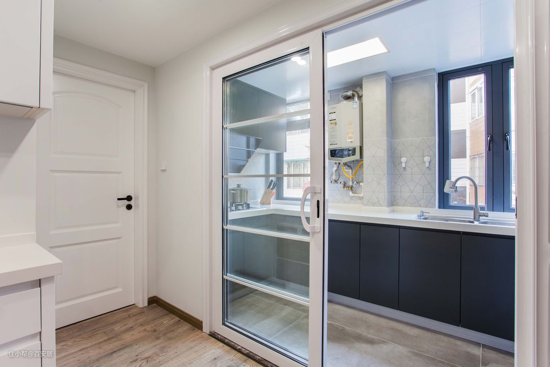 厨房拥有着双窗户的良好采光天然条件,我们就大胆的采用了深灰色的橱柜面板,配上白色的台面,意想不到的好效果。合理的L型料理台,台下水槽的与集中的电器的设计,让业主发挥出更好的厨艺。