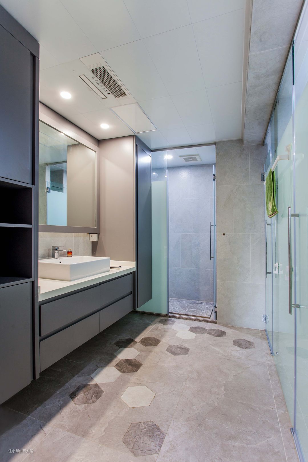 卫生间设计非常的有特色,大大的台盆摆放在外,挑空的造型不感觉沉闷与拖沓,地面上花砖特意的设计,让空间灵活起来。然后又独立了两个只有坐便位置的空间,用磨砂钢化玻璃与台面的干区隔断开来,淋浴房也是运用同样的手法,这让我们能联想到日式的这种设计理念,但这也不是完全一样。